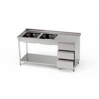Nerezový stôl s 2-miskovým drezom a 3-zásuvkovým blokom a policou 190x60x85 cm | FORGAST