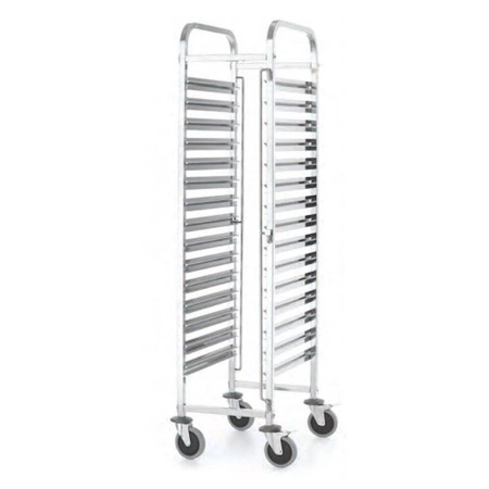 WózekNavrhnutý na prepravu až 15 nádob GN 1/1. Konštrukcia z nehrdzavejúcej ocele, ľahko sa udržiava v čistote. Usporiadanie sklzníc umožňuje prepravu rôznych konfigurácií kontajnerov GN 1/1, GN 1/2, GN 1/3. Na konci sklzníc je protišmyková ochrana. Vzdialenosť medzi koľajnicami je 8 cm. Jednoduché manévrovanie s jednotkou umožňujú 4 gumové nožičky s priemerom 10 cm a 2 brzdy.