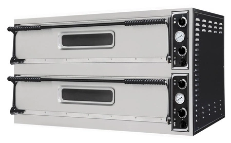 SLIM LINE 33 2-komorová pec na pizzu s manuálnym ovládaním. Každá komora pece pojme naraz 3 pizze s maximálnym priemerom 35 cm. Predná časť zariadenia je vyrobená z nehrdzavejúcej ocele a zvyšok krytu je vyrobený z ocele. Izolácia z minerálnej vlny. Dno komory vyložené šamotovými doskami s hrúbkou 14 mm. Vykurovacie telesá umiestnené v hornej a dolnej časti komory. Nastavenie ohrievačov pomocou nezávislých termostatov. Spotrebič má teplotný rozsah od 50 do 455C, časovač s rozsahom do 15 minút a samostatný teplomer pre každú komoru.