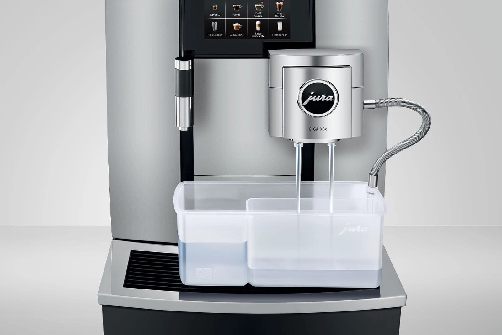 Automatický kávovar GIGA X3c od spoločnosti JURA v strieborno-čiernej farbe. Skvelý pre väčšie kancelárie, zasadacie miestnosti, kávové kútiky v obchodoch alebo na staniciach. Kávovar je určený na prípravu približne 150 šálok kávy denne. Vďaka použitiu úplne nových vnútorných komponentov je model GIGA X3c robustnejší, efektívnejší, inteligentnejší a ľahšie sa servisuje a hygienicky udržiava. Okrem toho zabudovaný elektronicky riadený keramický mlynček zaručuje neuveriteľnú životnosť zariadenia a dôsledne rovnomerné mletie zŕn. Proces pulznej extrakcie (P.E.P.®) dokonale reguluje čas prípravy ristretta a espressa. Kávovar má štandardne funkciu One-Touch na automatické čistenie mliečneho systému a nastaviteľnú (5-16 g) sparovaciu jednotku. Kávovar má 2 systémy ohrevu termoblokov, 2 systémy cirkulácie vody, systém na mlieko / vymeniteľnú koncovkuópre napenenie HP3 / CX2, dávkovač mletej kávy. Okrem toho je vybavený integrovaným programom na oplachovanie, čistenie a odstraňovanie vodného kameňa s hygienickou normou JURA: certifikát TÜV.