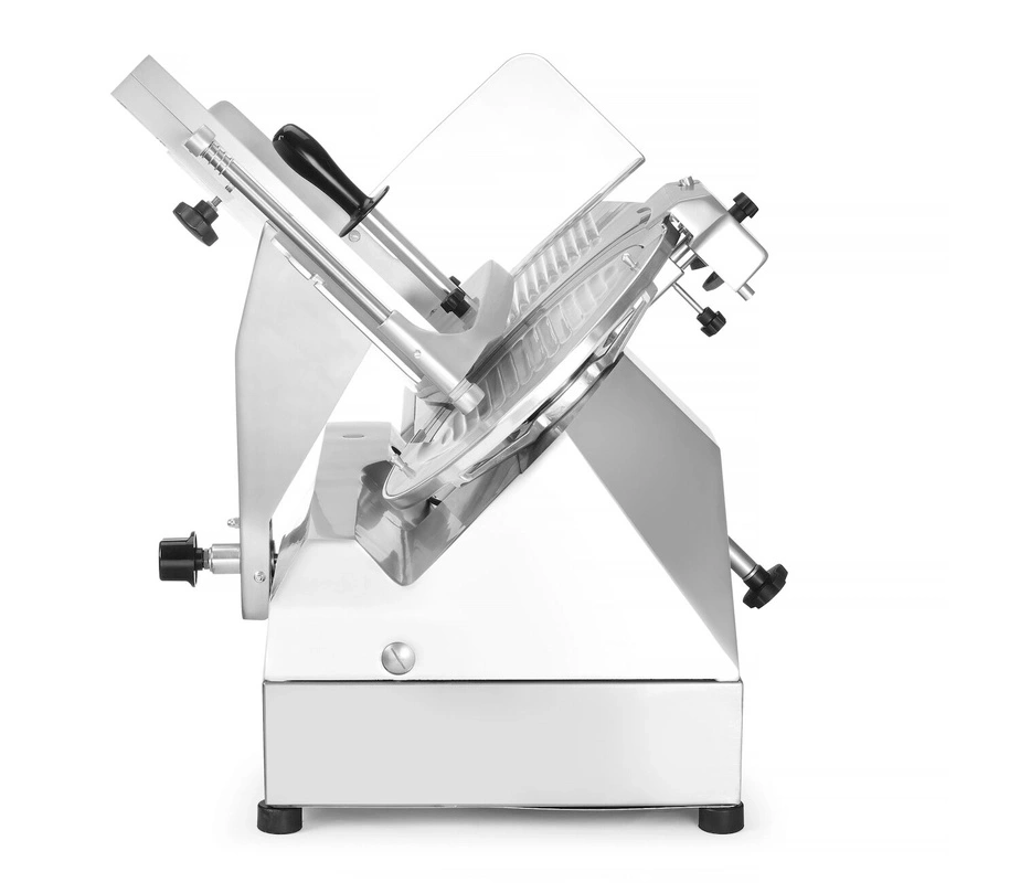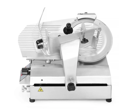 Motor: 370 W, vzduchom chladený, s ochranou proti prehriatiu, umožňuje krájanie tvrdých salám, syrov, údenín a mäsa a rýb (bez kostí/kostí). Nastavenie hrúbky plátku: Hrúbka rezu sa dá nastaviť v rozsahu od 0 mm do 16 mm pre dokonalé plátky. Zabudovaný ostrič: Zabezpečuje stály výkon rezacieho kotúča a udržiava ho vo výbornom stave počas celého používania. Bezpečnosť: Krájač spĺňa všetky bezpečnostné požiadavky pre zariadenia na profesionálne použitie. Medzi bezpečnostné prvky patrí blokovanie čepele v polohe 0, ochrana proti spusteniu pri odstránenom ostriči alebo kryte čepele a ochrana čepele vo forme pevného krúžku. Materiál: Puzdro z hliníka, pracovná doska z lisovaného hliníkového plechu, nože z nehrdzavejúcej ocele, čo zaručuje odolnosť a jednoduché čistenie. Demontáž a čistenie: Oceľový držiak možno ľahko rozobrať a umyť v umývačke riadu, čo uľahčuje udržiavanie hygieny. Približný maximálny rozmer rezaného výrobku: 310x260 mm