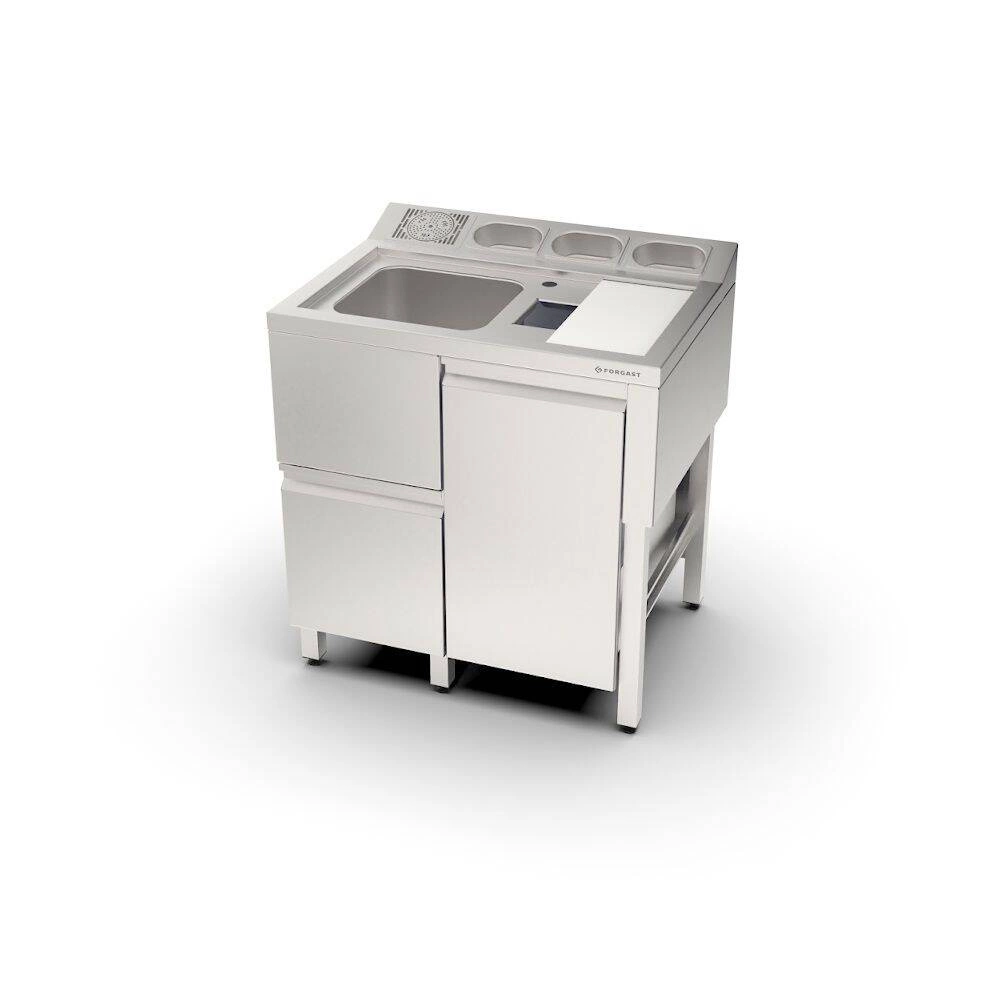 Barmanská stanica FORGAST FG15414 bola navrhnutá s dôrazom na maximálnu funkčnosť. Má priestranný drez s komorou hlbokou 20 cm, čo umožňuje pohodlné umývanie väčších nádob. Pod drezom sa nachádzajú praktické zásuvky na drobné barmanské príslušenstvo a výsuvný kôš na odpadky výrazne uľahčuje udržiavanie čistoty počas práce. Súčasťou balenia je oplachovač na rýchle umývanie pohárov a tri nádoby GN 1/9, ktoré môžu slúžiť na rôzne prísady, ovocie alebo koreniny. Pracovný stôl s PVC doskou na krájanie umožňuje rýchlu a hygienickú prípravu surovín.