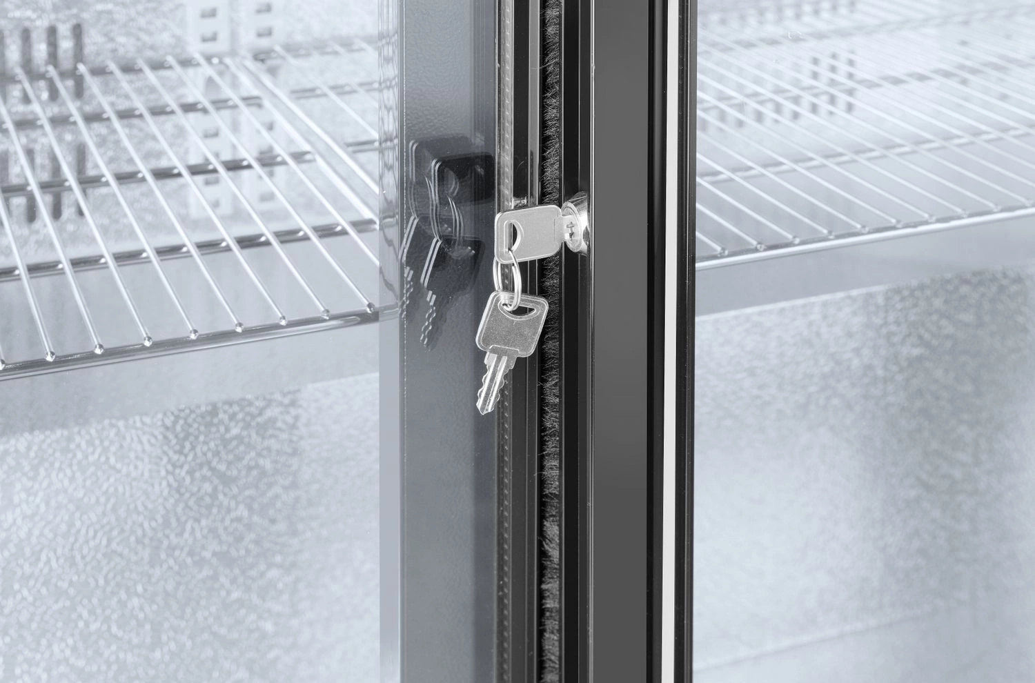 • Tri posuvné dvere z tvrdeného skla – zabezpečujú jednoduchý prístup do vnútra a viditeľnosť produktov bez nutnosti otvárať chladničku, čo minimalizuje straty chladu.