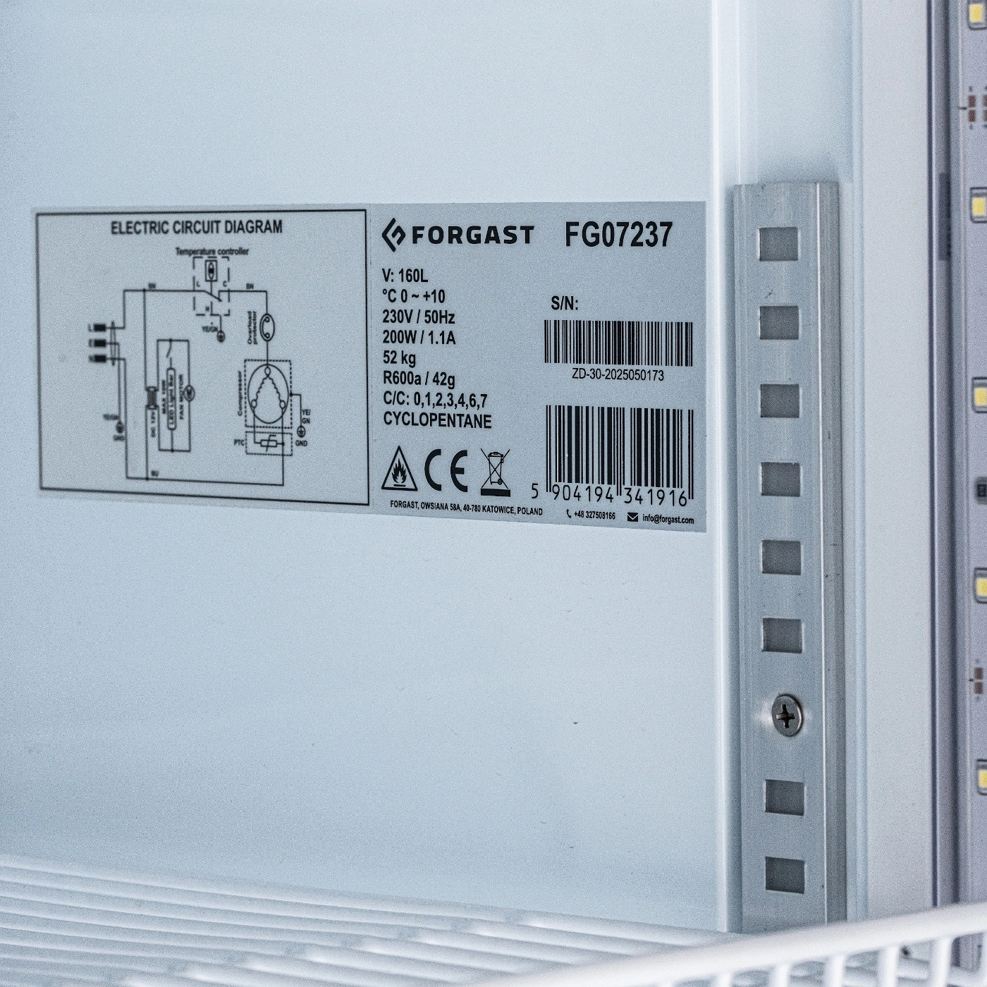 Barová chladnička Forgast FG07237 je kombináciou vysokej účinnosti, moderného dizajnu a praktických riešení, vďaka ktorým je ideálnou voľbou pre profesionálov. Využitie dvojito presklených dverí, dynamického chladenia a zabezpečenia na kľúč poskytuje bezpečnosť, komfort a efektívnu prezentáciu produktov. Pevná konštrukcia, jednoduchá obsluha a možnosť individuálnej konfigurácie vnútorného priestoru zaručujú, že zariadenie splní očakávania aj tých najnáročnejších používateľov. Je to riešenie, ktoré vám umožní dbať o kvalitu a atraktívnosť ponuky v každom gastronomickom podniku.
