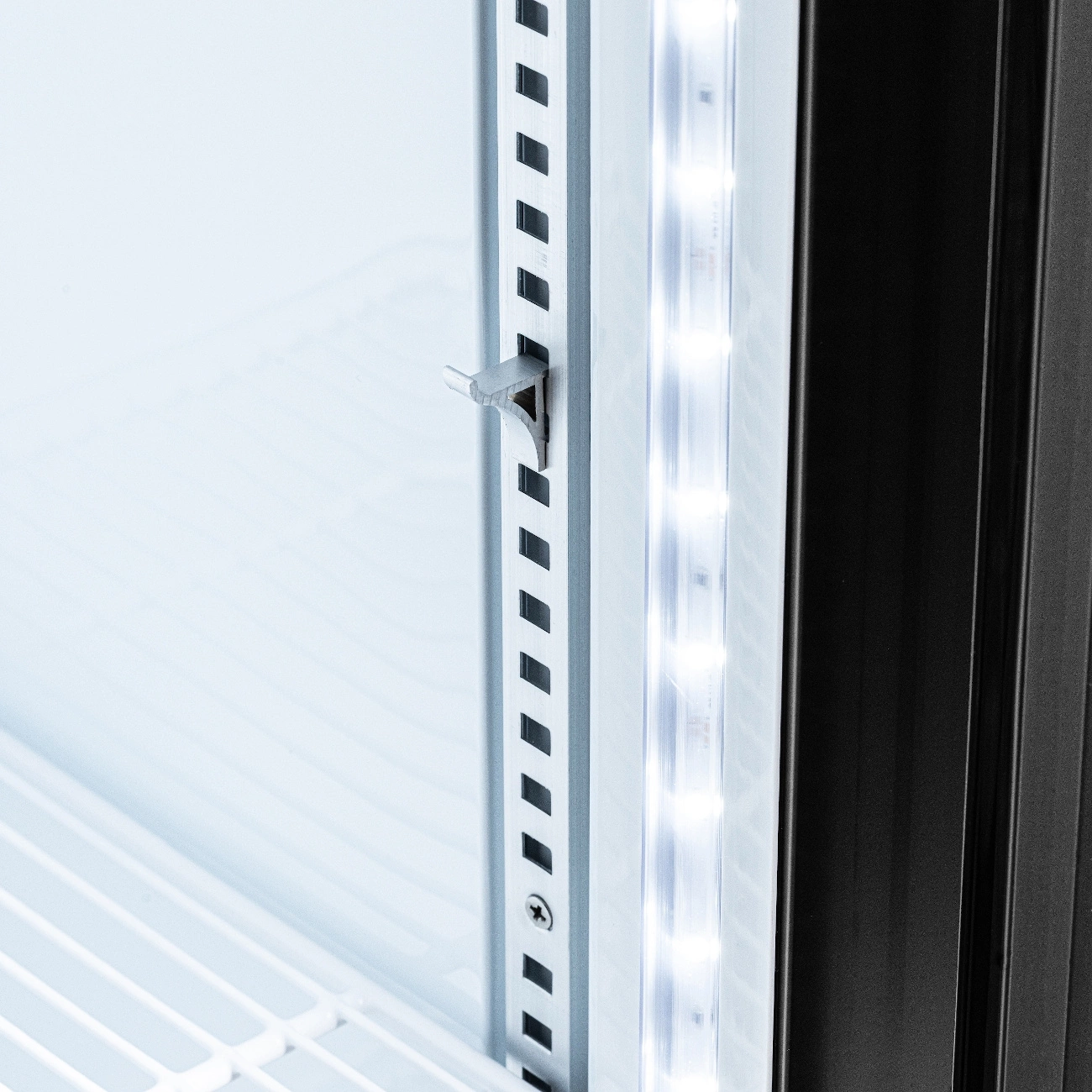 - Dvojito presklené dvere so samozatváračom – zabezpečujú vynikajúcu viditeľnosť obsahu a pomáhajú udržať stabilnú teplotu v chladiacej komore. Vďaka tomu sú produkty vždy správne vychladené a prezentácia nápojov je pre zákazníkov atraktívnejšia.
