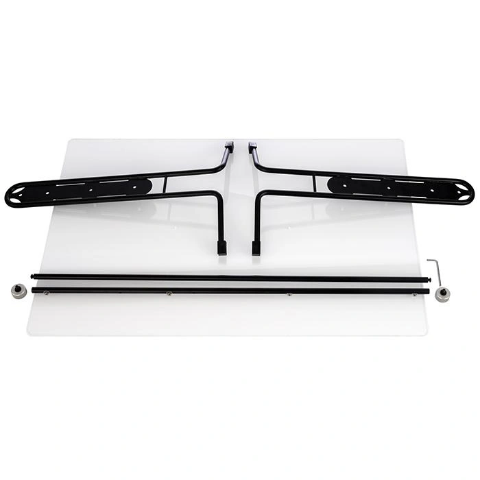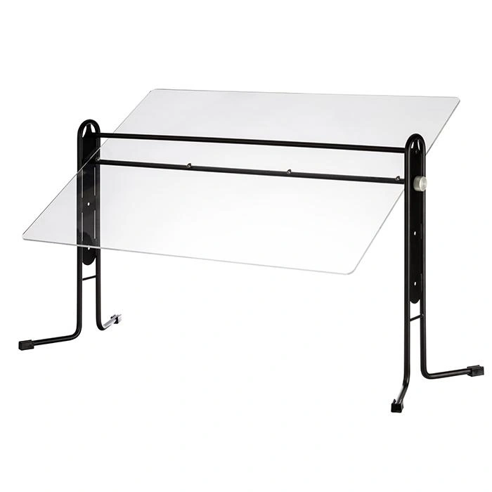 Produkt je postavený na pevnom kovovom ráme v čiernej farbe a priehľadnej akrylátovej doske, čo zaručuje odolnosť a estetický vzhľad. Ochranná doska je vybavená plynulým nastavením, ktoré umožňuje správne nastavenie podľa potreby. Materiály použité pri výrobe zabezpečujú jednoduchú údržbu a odolnosť voči poškodeniu.