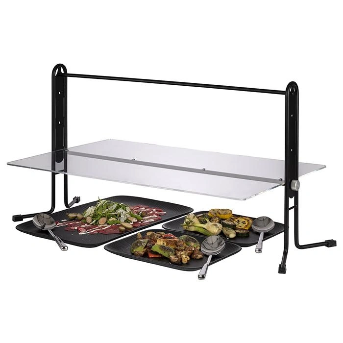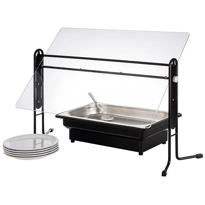 Bufetový kryt je praktické riešenie zabezpečujúce hygienickú ochranu jedál pri servírovaní v bufetoch, reštauráciách alebo na podujatiach. Produkt sa vyznačuje pevným čiernym rámom, veľkou ochrannou plochou a možnosťou nastavenia uhla sklonu priehľadnej akrylátovej dosky. Skvele poslúži v gastronómii aj na akciách, kde je potrebné esteticky a efektívne chrániť jedlo.