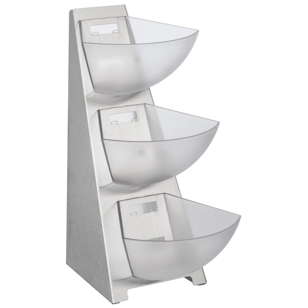 Stojan bol navrhnutý s dôrazom na pohodlie používania a estetiku prezentácie. Má tri poschodia, na ktorých sú umiestnené nádoby s objemom približne 1 liter každá. Matný, leštený rám z nehrdzavejúcej ocele dodáva konštrukcii stabilitu a eleganciu, zatiaľ čo nádoby z priehľadného plastu umožňujú efektné vystavenie obsahu. Vďaka kompaktným rozmerom je stojan vhodný na väčšie aj menšie bufety.