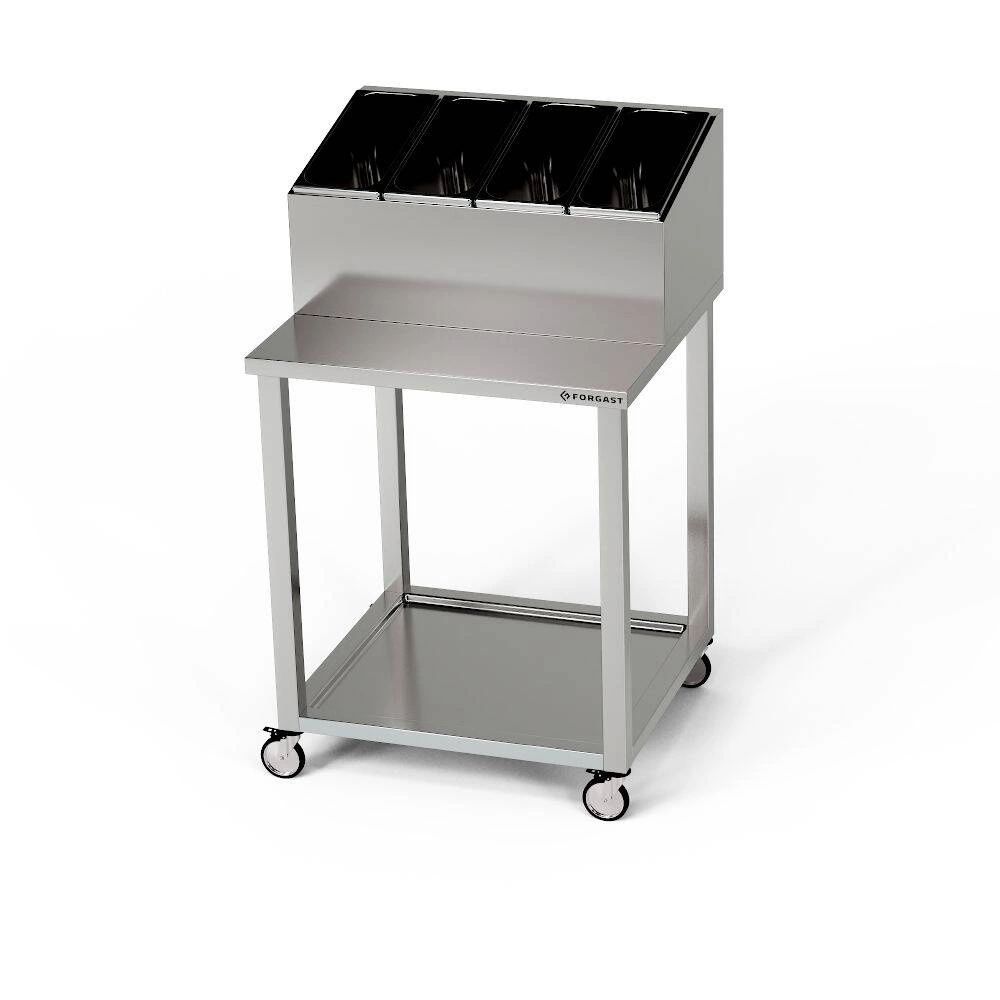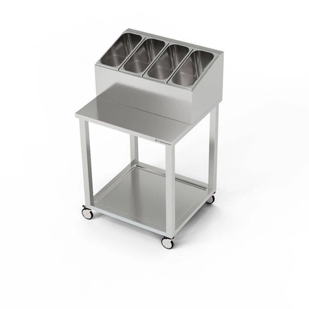 Robustná zváraná konštrukcia pre stabilitu. Vybavený 4 otočnými kolieskami a nadstavcom na uloženie 4 nádob GN 1/4 s maximálnou hĺbkou 15 cm. GN kontajnery nie sú súčasťou dodávky.