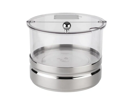 Nádoba sa skladá z niekoľkých praktických častí: vysoko leštená oceľová základňa, vyberateľná chladiaca vložka, objemná misa a výklopná, priehľadná pokrievka vybavená tabuľkou na popis obsahu. Takáto konštrukcia zaisťuje jednoduché používanie aj jednoduchú údržbu čistoty.