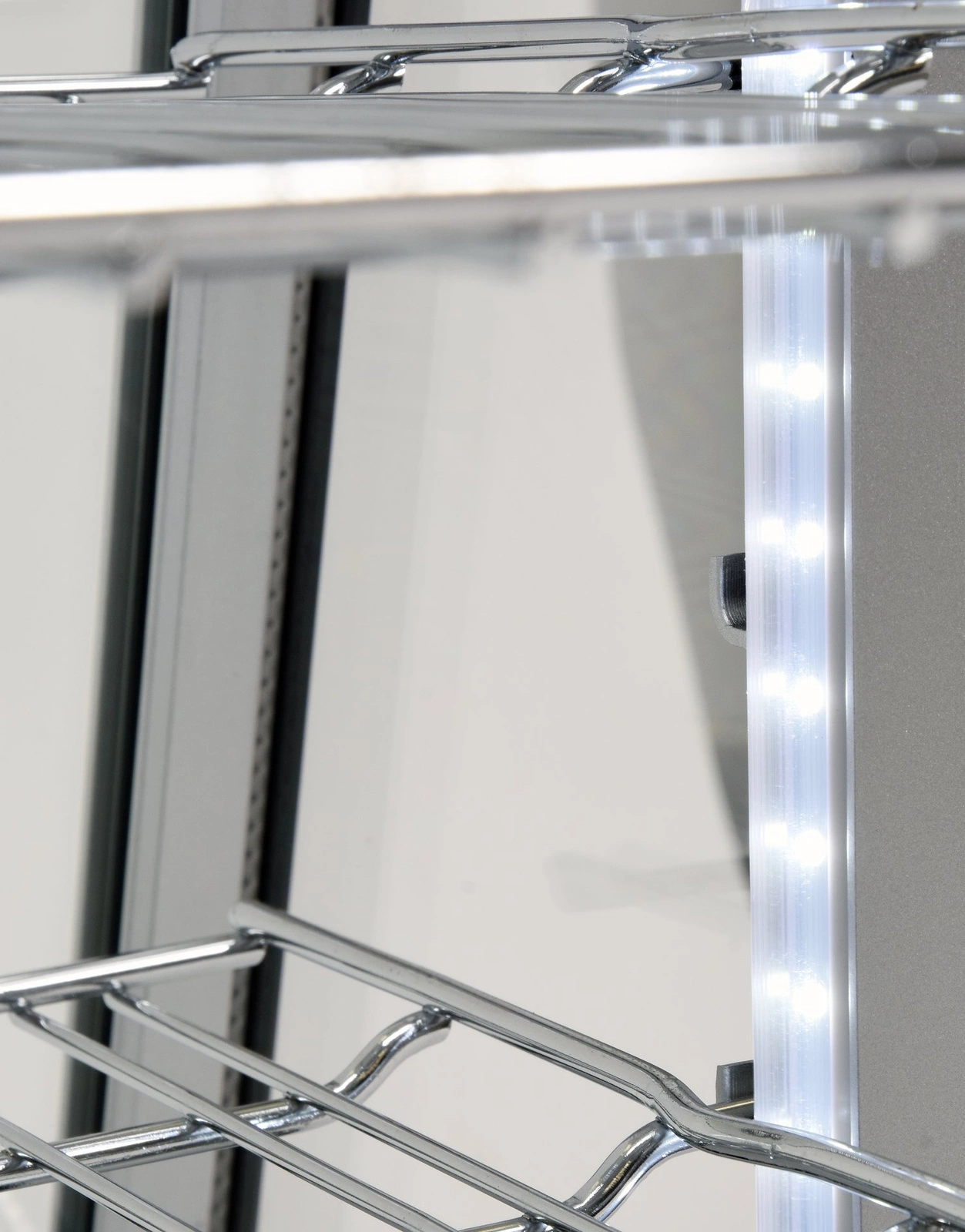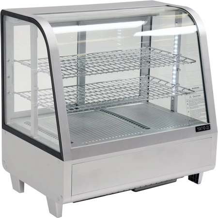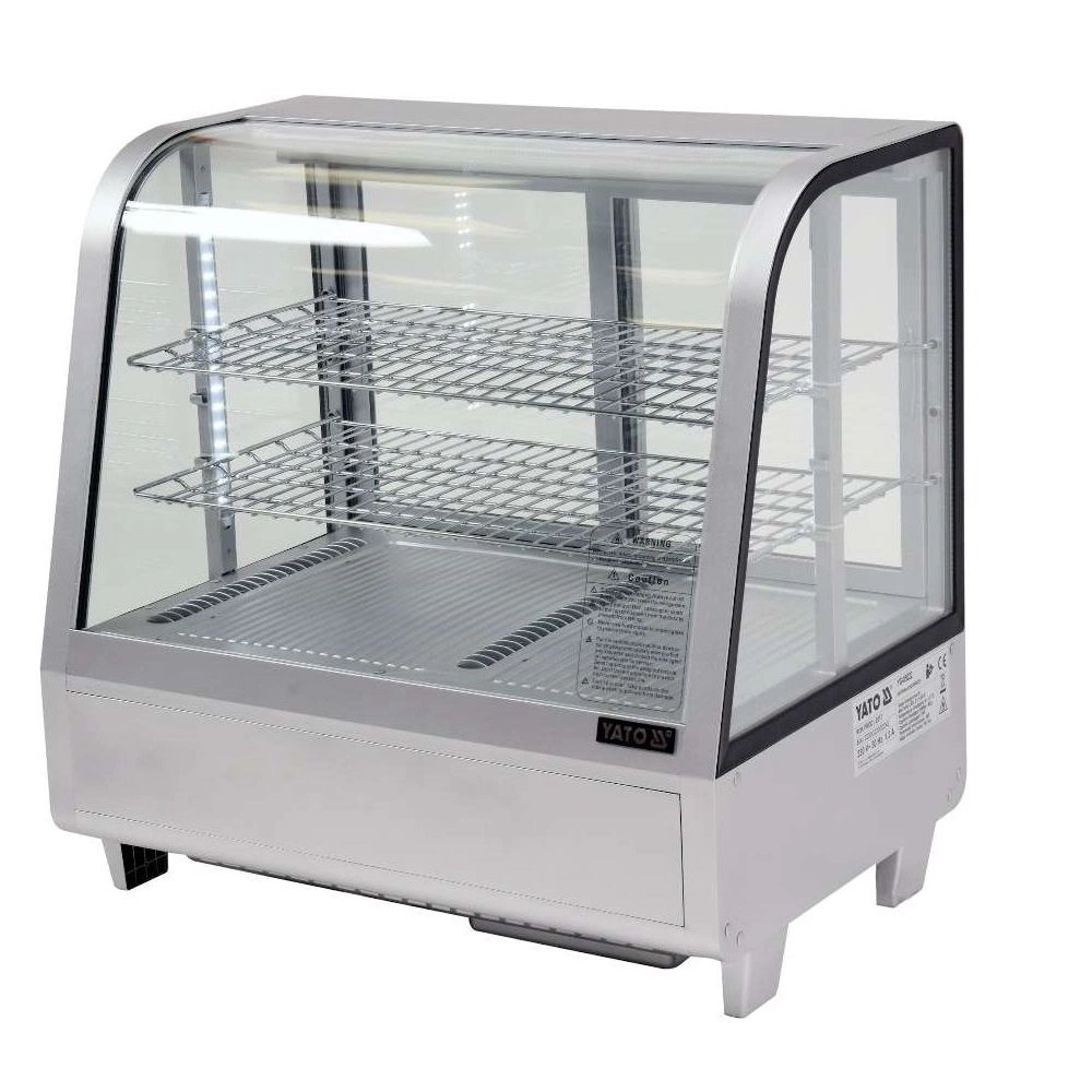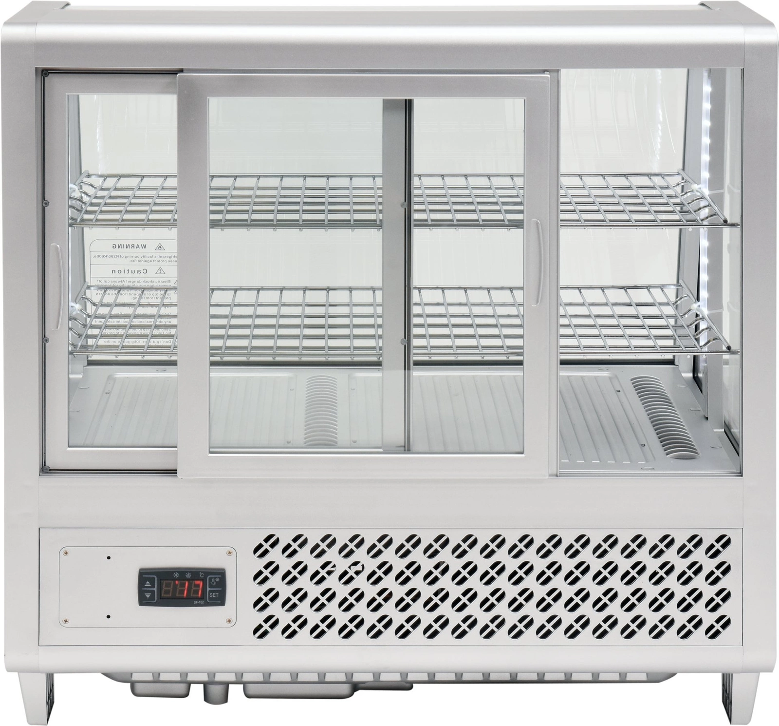 Chladená vitrína so sklenenými stenami zo 4 strán s objemom 100 l. Strieborná farba. Vyrobená z vysoko kvalitných surovín. Ideálna na vystavovanie produktov ako sú koláče, torty, mini občerstvenie. Súčasťou vybavenia sú dve povlakované police s možnosťou nastavenia výšky, čo umožňuje usporiadanie produktov rôznych rozmerov. Prístup do vnútra vitríny je zabezpečený pomocou posuvných sklenených dvierok, ktoré sú vyrobené z tvrdeného skla, rovnako ako zaoblené predné sklo a bočné sklá – vďaka tomu sú veľmi odolné a majú dobré izolačné vlastnosti. Vitrína je vybavená LED osvetlením, čo umožňuje ešte atraktívnejšiu prezentáciu produktov.