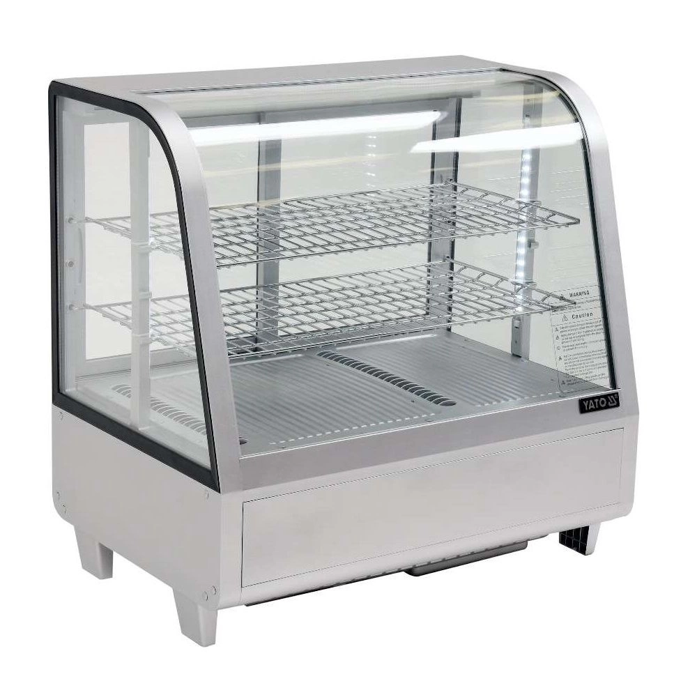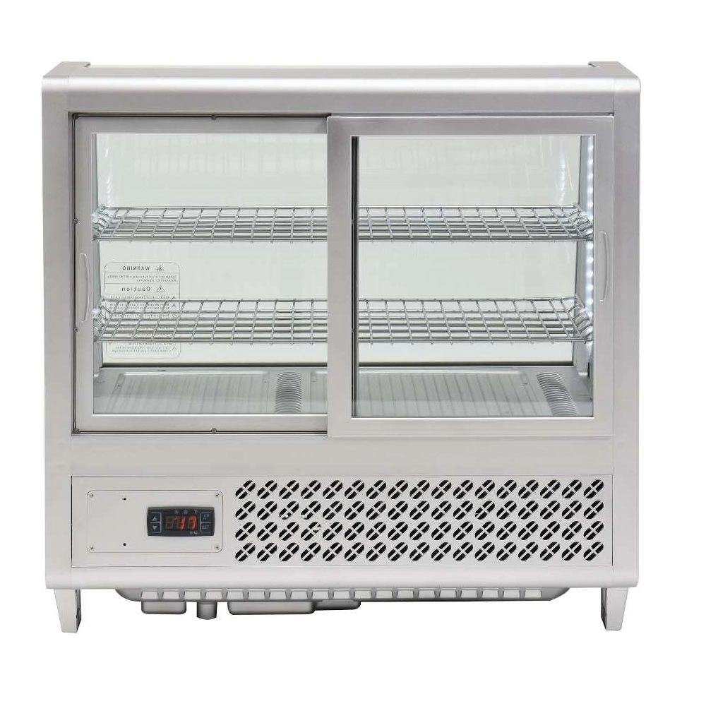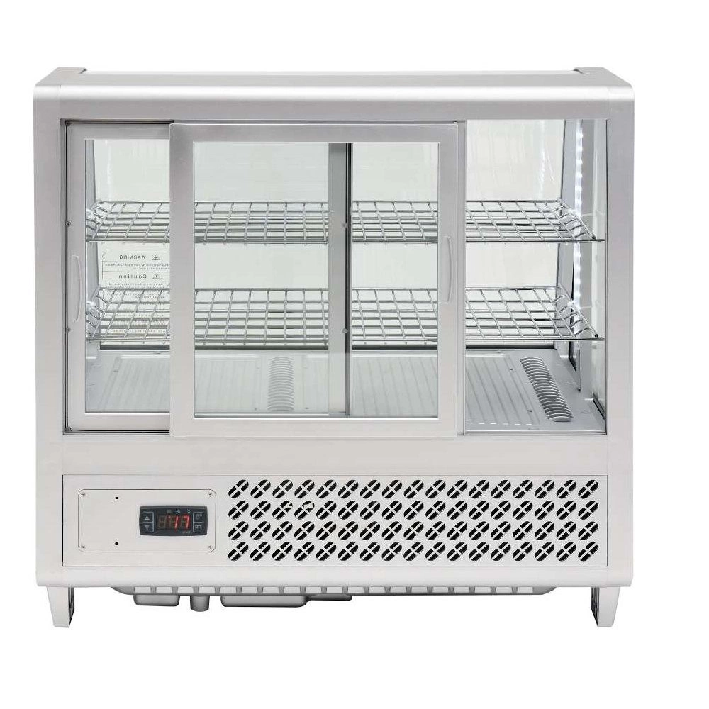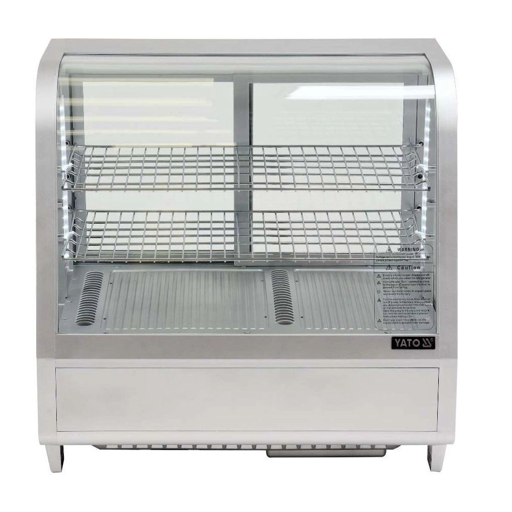 Chladená vitrína so sklenenými stenami zo 4 strán s objemom 100 l. Strieborná farba. Vyrobená z vysoko kvalitných surovín. Ideálna na vystavovanie produktov ako sú koláče, torty, mini občerstvenie. Súčasťou vybavenia sú dve povlakované police s možnosťou nastavenia výšky, čo umožňuje usporiadanie produktov rôznych rozmerov. Prístup do vnútra vitríny je zabezpečený pomocou posuvných sklenených dvierok, ktoré sú vyrobené z tvrdeného skla, rovnako ako zaoblené predné sklo a bočné sklá – vďaka tomu sú veľmi odolné a majú dobré izolačné vlastnosti. Vitrína je vybavená LED osvetlením, čo umožňuje ešte atraktívnejšiu prezentáciu produktov.