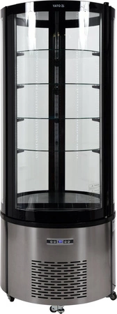 Okrúhla chladiaca vitrína s objemom 400 l. Vyrobená z vysoko kvalitných surovín. Ideálna na vystavovanie tort a zákuskov. Vybavenie zahŕňa 4 police z tvrdeného skla s nastaviteľnou výškou. Prístup do vnútra vitríny je možný cez sklenené dvierka z tvrdeného skla s funkciou samo-zatvárania. Vitrína má LED osvetlenie. Chladiaca jednotka používa chladiace médium R290. Zariadenie má elektronický ovládač s digitálnym displejom teploty. Vitrína má 4 nožičky so zabudovanými kolieskami – keď sú nožičky zaskrutkované, vitrína stojí na kolieskach a dá sa jednoducho presunúť na iné miesto. Ak sú nožičky vyskrutkované, vitrína stojí stabilne na podlahe a je zafixovaná.