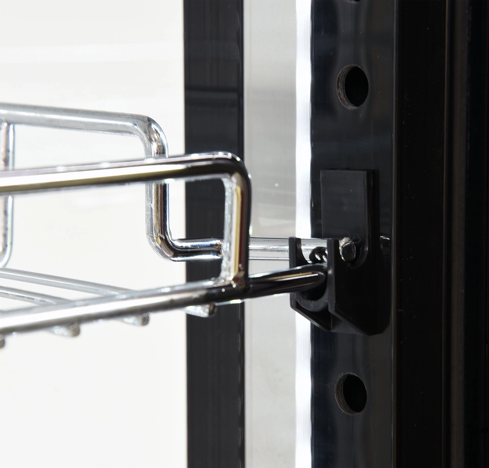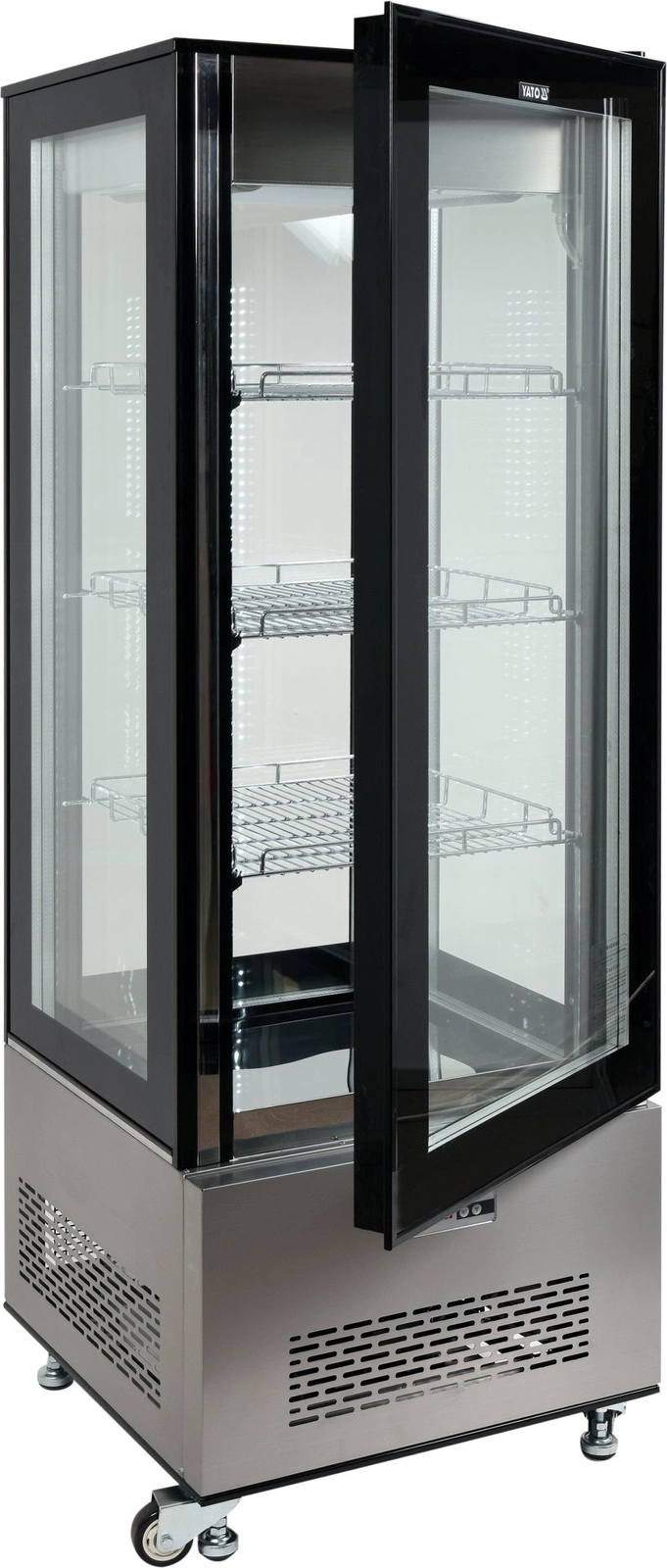 Chladiaca vitrína s objemom 400 l. Vyrobená z vysokokvalitných surovín. Ideálna na vystavovanie produktov ako sú zákusky, torty, mini občerstvenie alebo rôzne druhy smoothie. Vo výbave dve zosilnené a chrómované police s nastaviteľnou výškou uchytenia. Prístup do vnútra vitríny je zabezpečený dvierkami, ktoré sú vyrobené z dvojvrstvového tvrdeného skla rovnako ako čelné a bočné sklá. Vitrína má LED osvetlenie zo 4 strán. Chladiaca jednotka využíva chladivo R290. Zariadenie je vybavené elektronickým ovládačom s digitálnym displejom teploty. Navyše má vitrína vypínač napájania, ktorý umožňuje zapnutie alebo vypnutie v ľubovoľnom okamihu bez nutnosti odpojenia od elektriny. Vitrína má 4 kolieska, vďaka ktorým je jej premiestnenie jednoduché a rýchle. Navyše má 4 výškovo nastaviteľné nožičky, ktoré ju stabilizujú a umožňujú jej vyrovnanie.