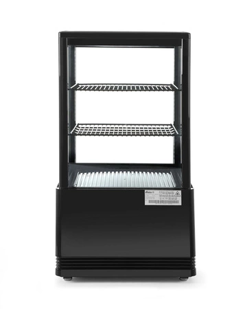 Nastavenie chladiacej vitríny s objemom 58 litrov. Kryt z nehrdzavejúcej ocele lakovaný čiernou farbou. Dvojité sklo s ľahko otvárateľnými krídlovými dverami. Digitálny displej, elektronický termostat. Nútené chladenie s automatickým odmrazovaním. Vzduchový kanál na vonkajšej strane skla na odstránenie a zabránenie kondenzácie. Vnútorné osvetlenie v strope. Nastaviteľné oceľové pólopatky, potiahnuté PVC.