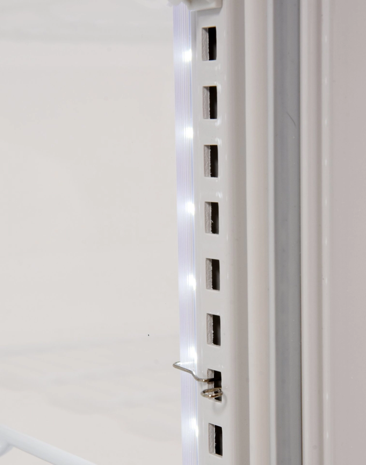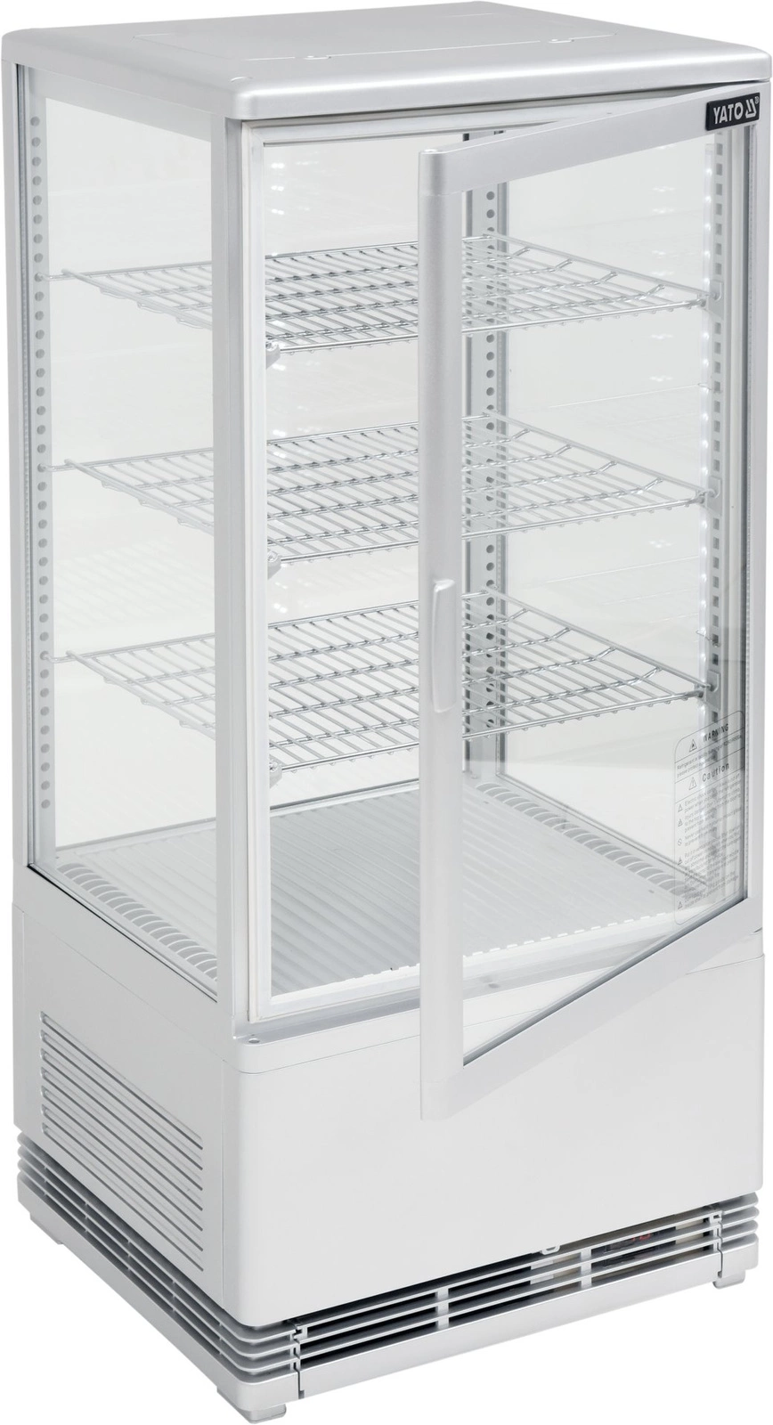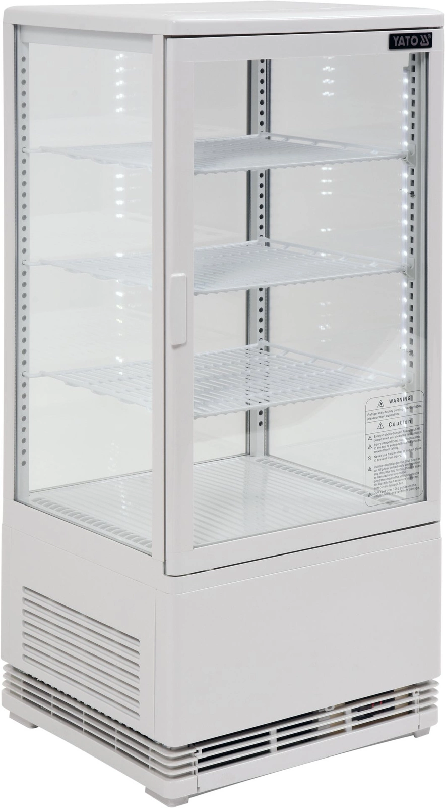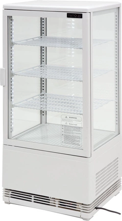 Chladiaca vitrína s objemom 78 l. Biela farba. Vyrobená z vysokokvalitných surovín. Ideálna na vystavovanie produktov ako sú zákusky, torty, mini občerstvenia alebo rôzne druhy smoothie. Vo výbave sú 3 zosilnené police potiahnuté PVC s nastaviteľnou výškou uchytenia. Prístup do vnútra vitríny je cez sklenené dvierka vyrobené z dvojvrstvového tvrdeného skla, rovnako ako čelné a bočné sklá. Vitrína má LED osvetlenie z 2 strán. Chladiaca jednotka využíva chladiace médium R600a. Zariadenie má elektronický ovládač s digitálnym displejom teploty.
