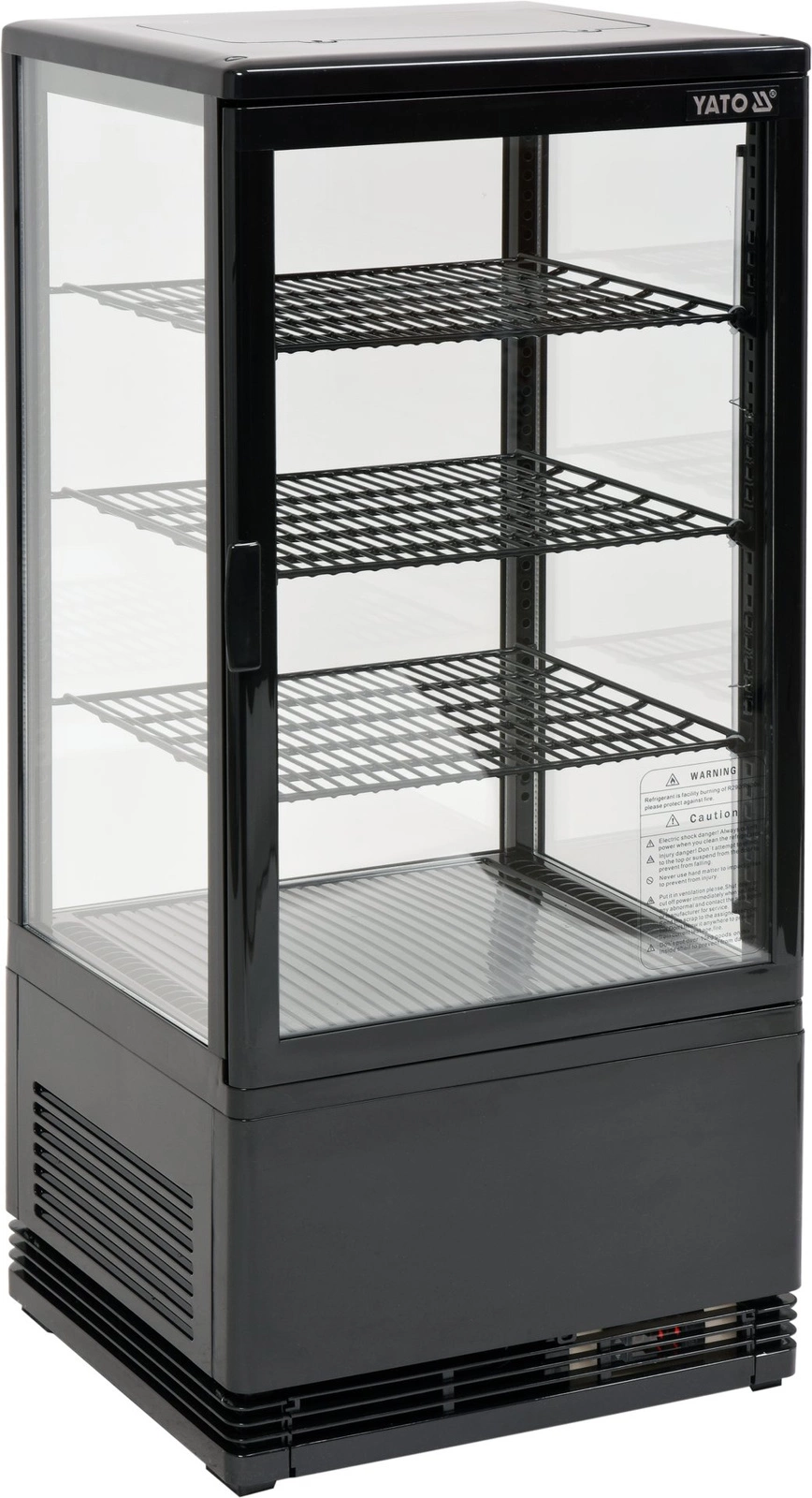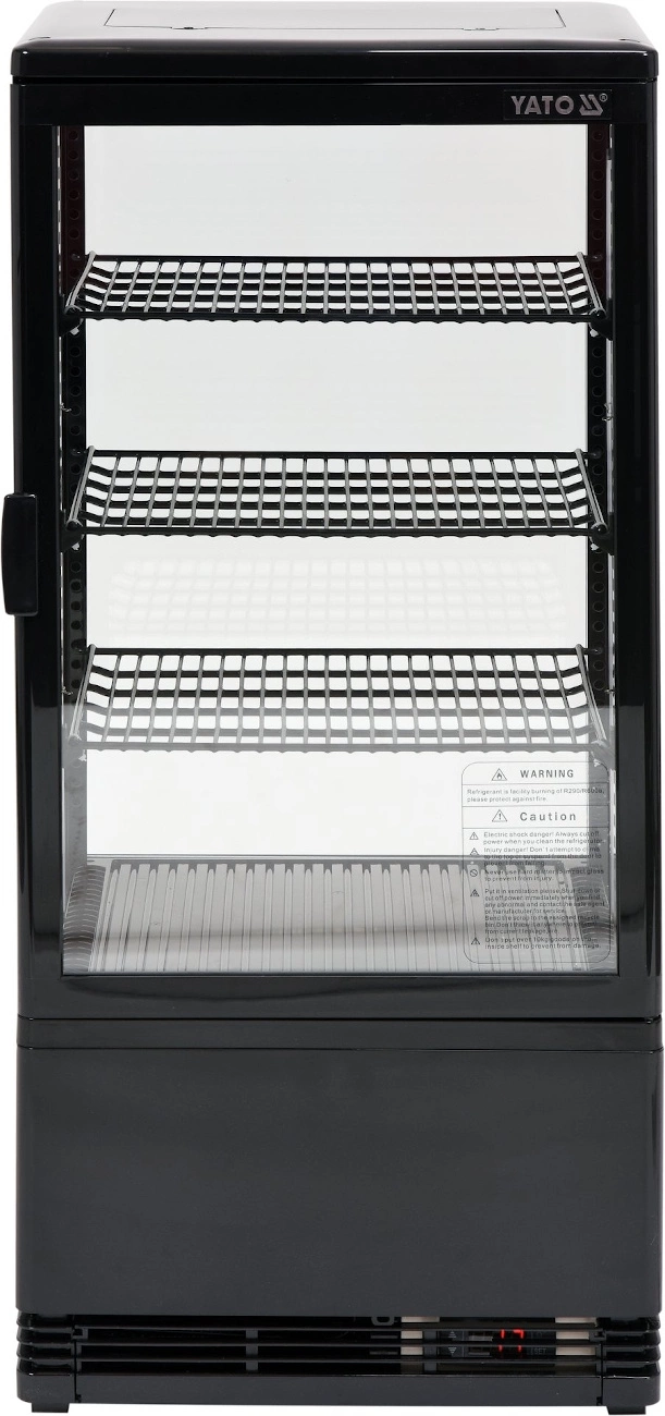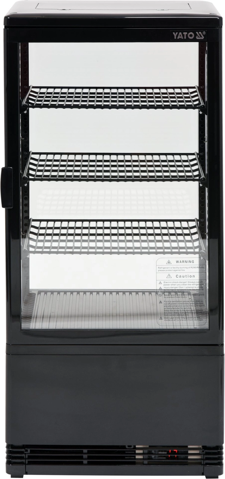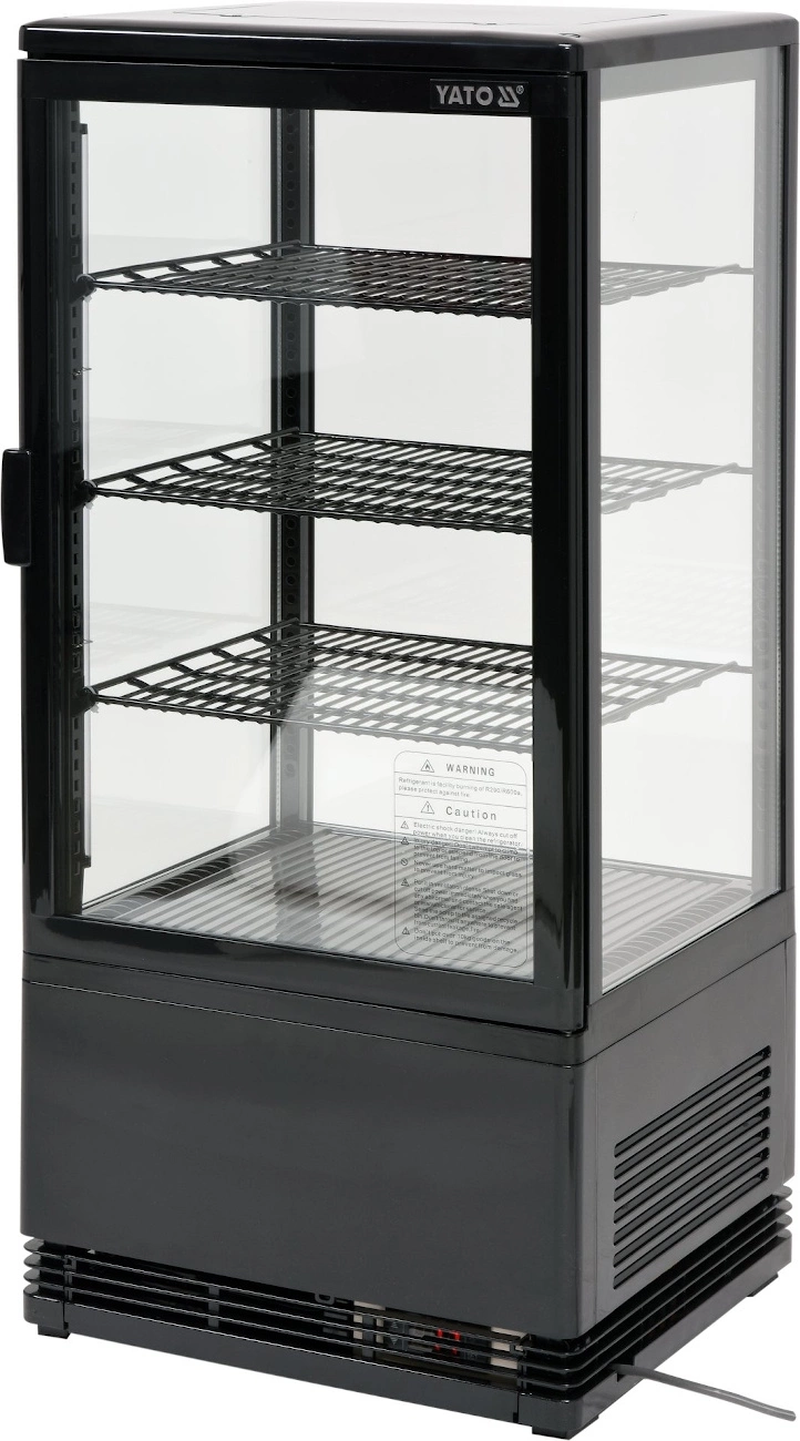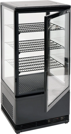 Chladiaca vitrína s objemom 78 l. Čierna farba. Vyrobená z vysokokvalitných surovín. Ideálna na vystavovanie produktov ako sú zákusky, torty, mini občerstvenia alebo rôzne druhy smoothie. Vybavená 3 zosilnenými policami s PVC povrchom s nastaviteľnou výškou uchytenia. Prístup do vnútra vitríny je cez sklenené dvierka vyrobené z dvojvrstvového tvrdeného skla, rovnako ako čelné a bočné sklá. Vitrína má LED osvetlenie z dvoch strán. Chladiaca jednotka využíva chladiace médium R600a. Zariadenie má elektronický ovládač s digitálnym displejom teploty.