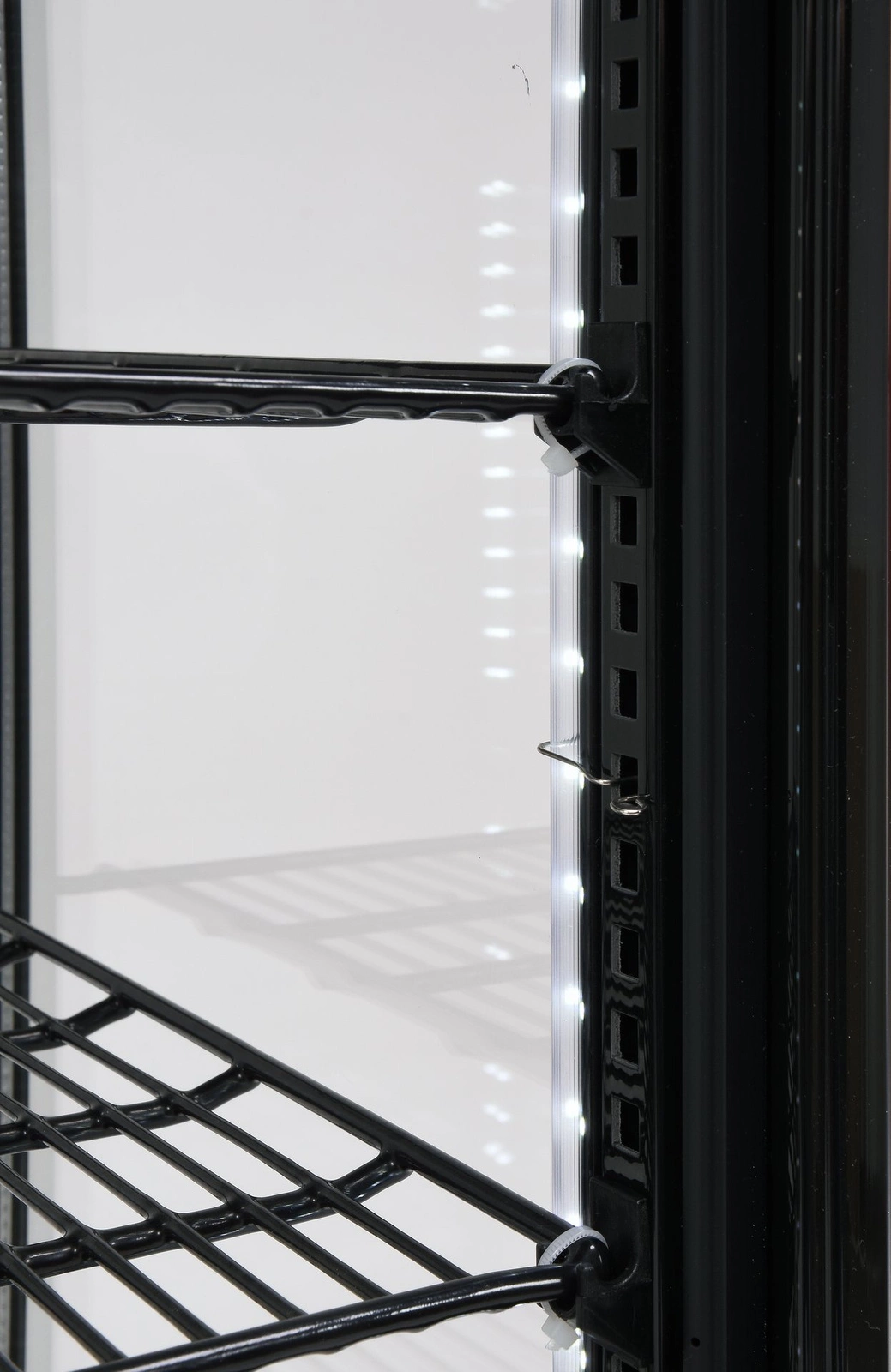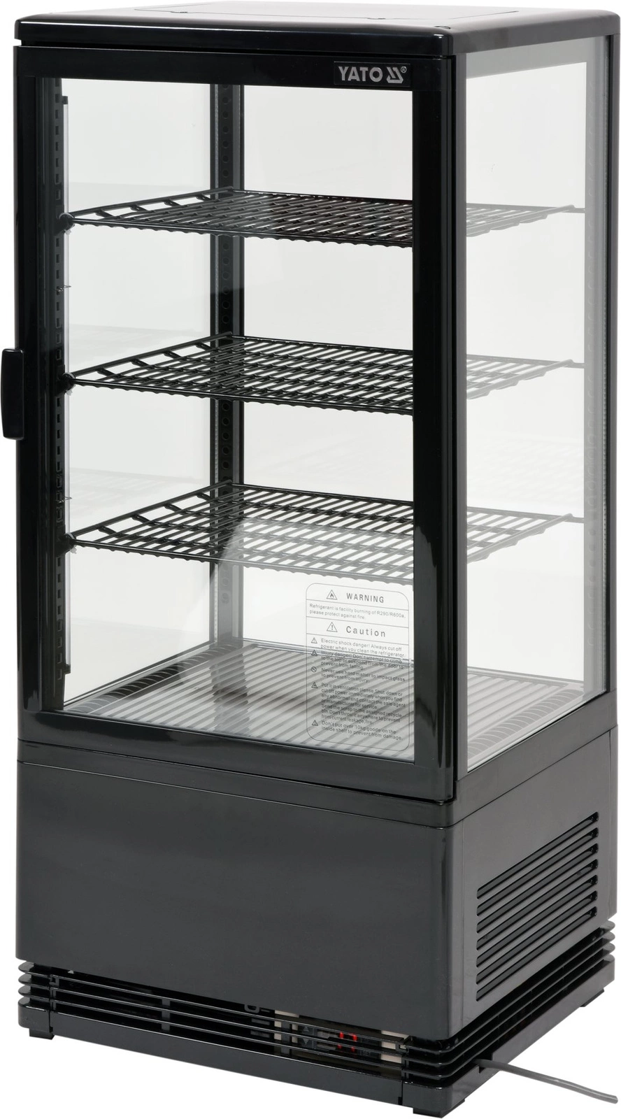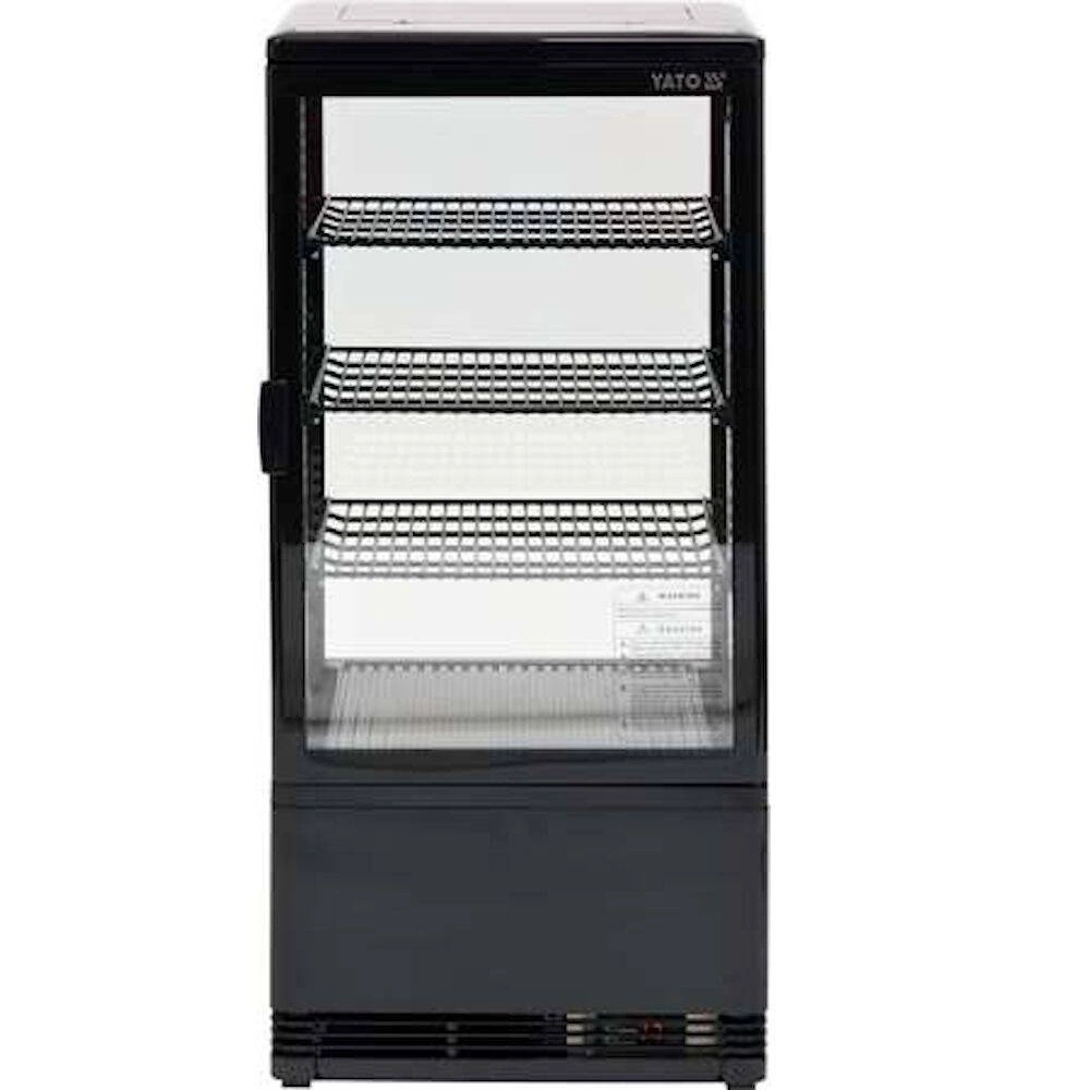 Chladiaca vitrína s objemom 78 l. Čierna farba. Vyrobená z vysokokvalitných surovín. Ideálna na vystavovanie produktov ako sú zákusky, torty, mini občerstvenia alebo rôzne druhy smoothie. Vybavená 3 zosilnenými policami s PVC povrchom s nastaviteľnou výškou uchytenia. Prístup do vnútra vitríny je cez sklenené dvierka vyrobené z dvojvrstvového tvrdeného skla, rovnako ako čelné a bočné sklá. Vitrína má LED osvetlenie z dvoch strán. Chladiaca jednotka využíva chladiace médium R600a. Zariadenie má elektronický ovládač s digitálnym displejom teploty.