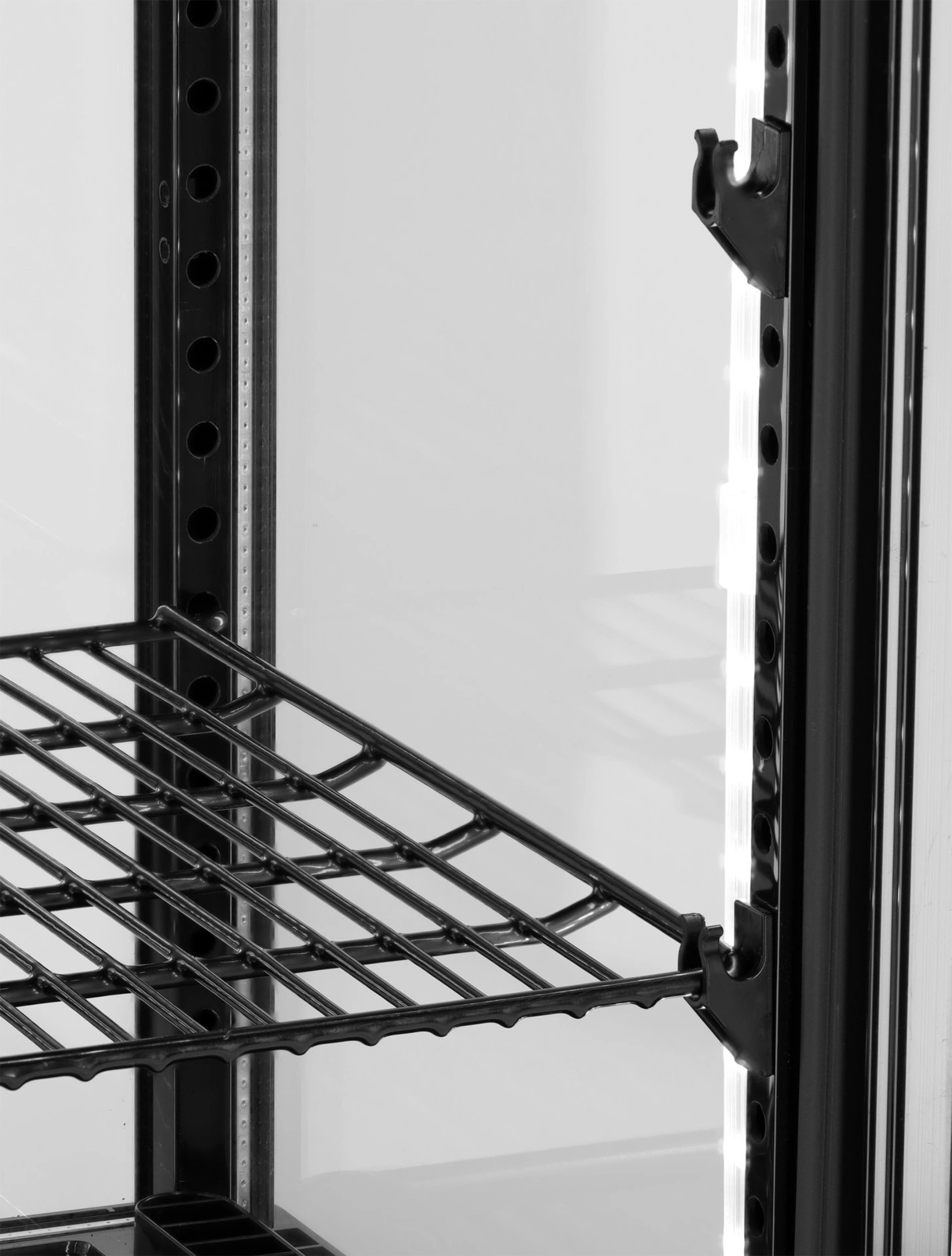 Dvojité tvrdené sklo, pevná konštrukcia a prítomnosť kondenzátora a ventilátora výparníka zabezpečujú spoľahlivú a bezpečnú prevádzku zariadenia. Dve drôtené police umožňujú pohodlné rozloženie produktov a štyri nastaviteľné nožičky uľahčujú vyrovnanie vitríny na akomkoľvek povrchu.
