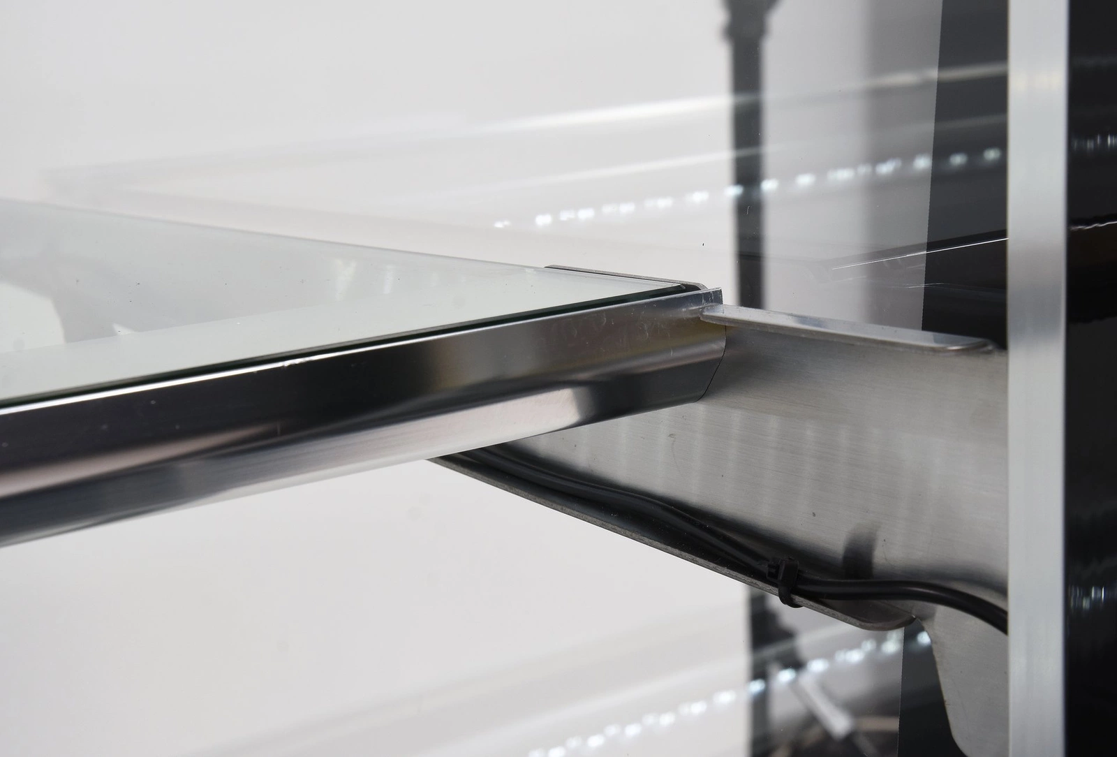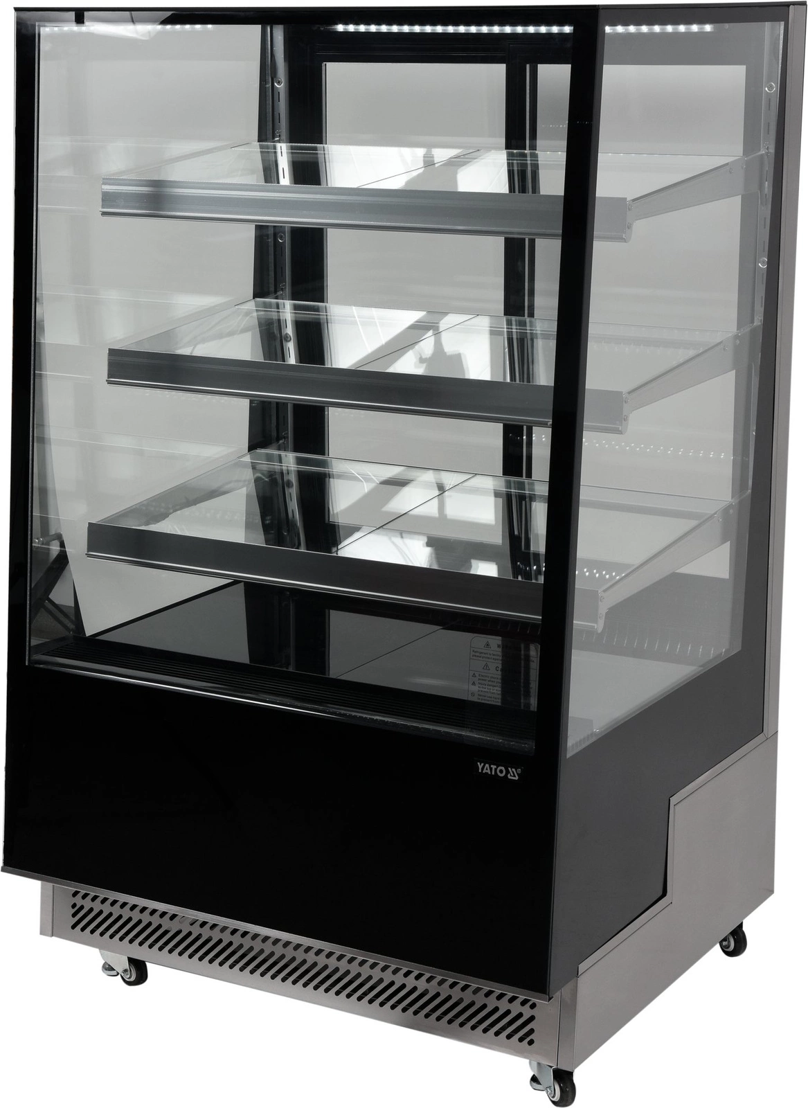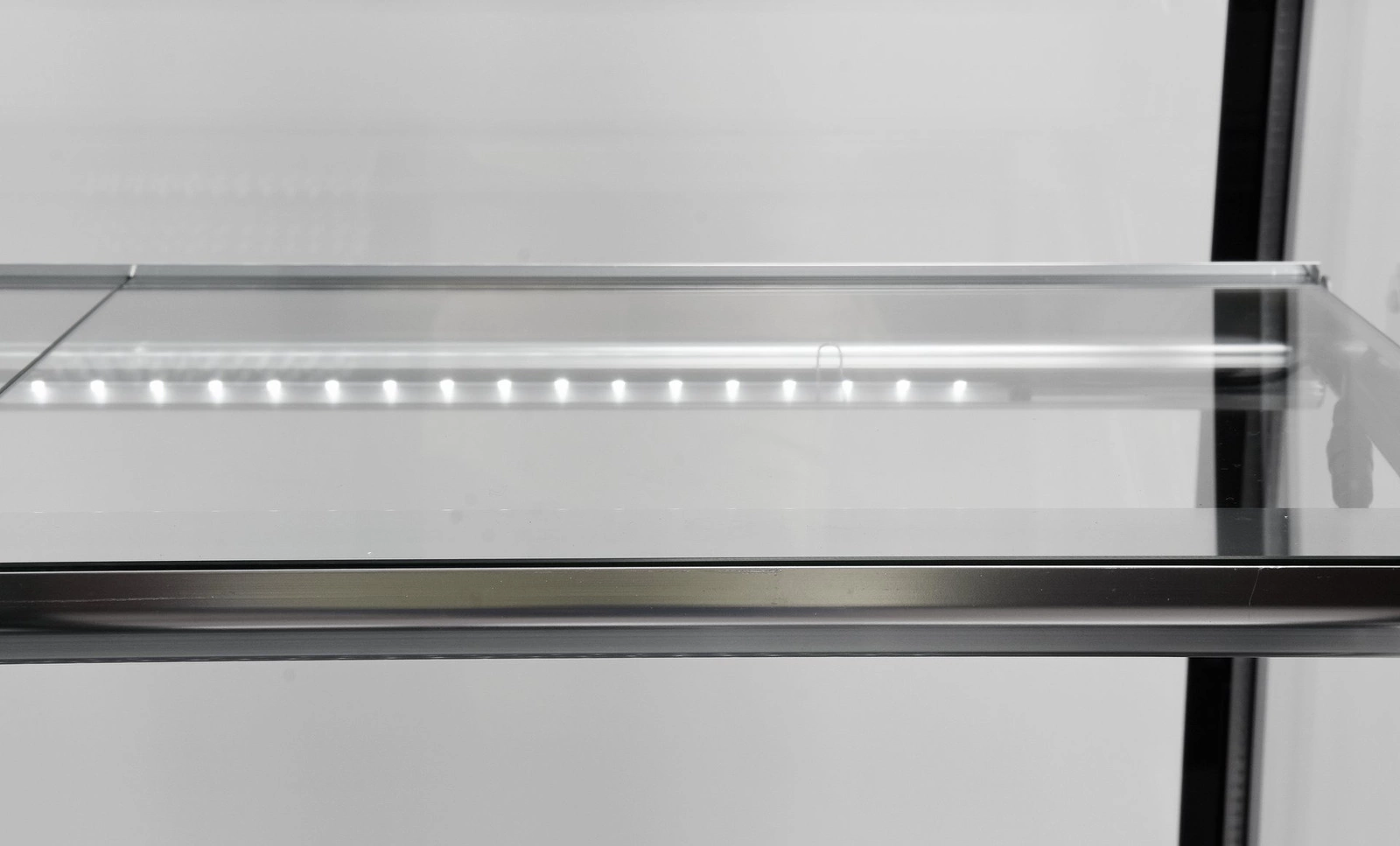 Chladiaca vitrína s objemom 400 l. Vyrobená z vysokokvalitných surovín. Ideálna na vystavovanie produktov ako sú zákusky, torty, malé občerstvenia alebo rôzne druhy smoothie. Vybavenie zahŕňa tri sklenené police s možnosťou nastavenia polohy, čo umožňuje usporiadanie produktov rôznych rozmerov. Prístup do vnútra vitríny je zabezpečený dvierkami, ktoré sú vyrobené z dvojvrstvového tvrdeného skla, rovnako ako predné a bočné sklá. Vitrína má LED osvetlenie namontované pod každou policou. Chladiaca jednotka využíva chladiaci prostriedok R290. Zariadenie je vybavené elektronickým ovládačom s digitálnym displejom teploty. Navyše má vitrína vypínač napájania, ktorý umožňuje zapnutie alebo vypnutie kedykoľvek bez nutnosti odpojenia od elektriny. Vitrína má 4 kolieska, vďaka ktorým je jej premiestňovanie jednoduché a rýchle. Okrem toho má 4 nastaviteľné nožičky, ktoré ju stabilizujú a umožňujú vyrovnanie.
