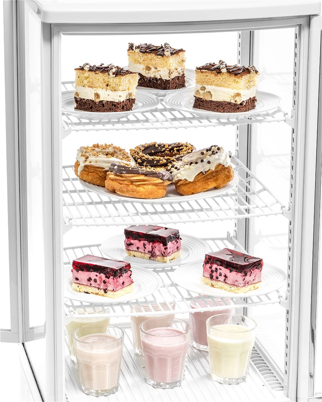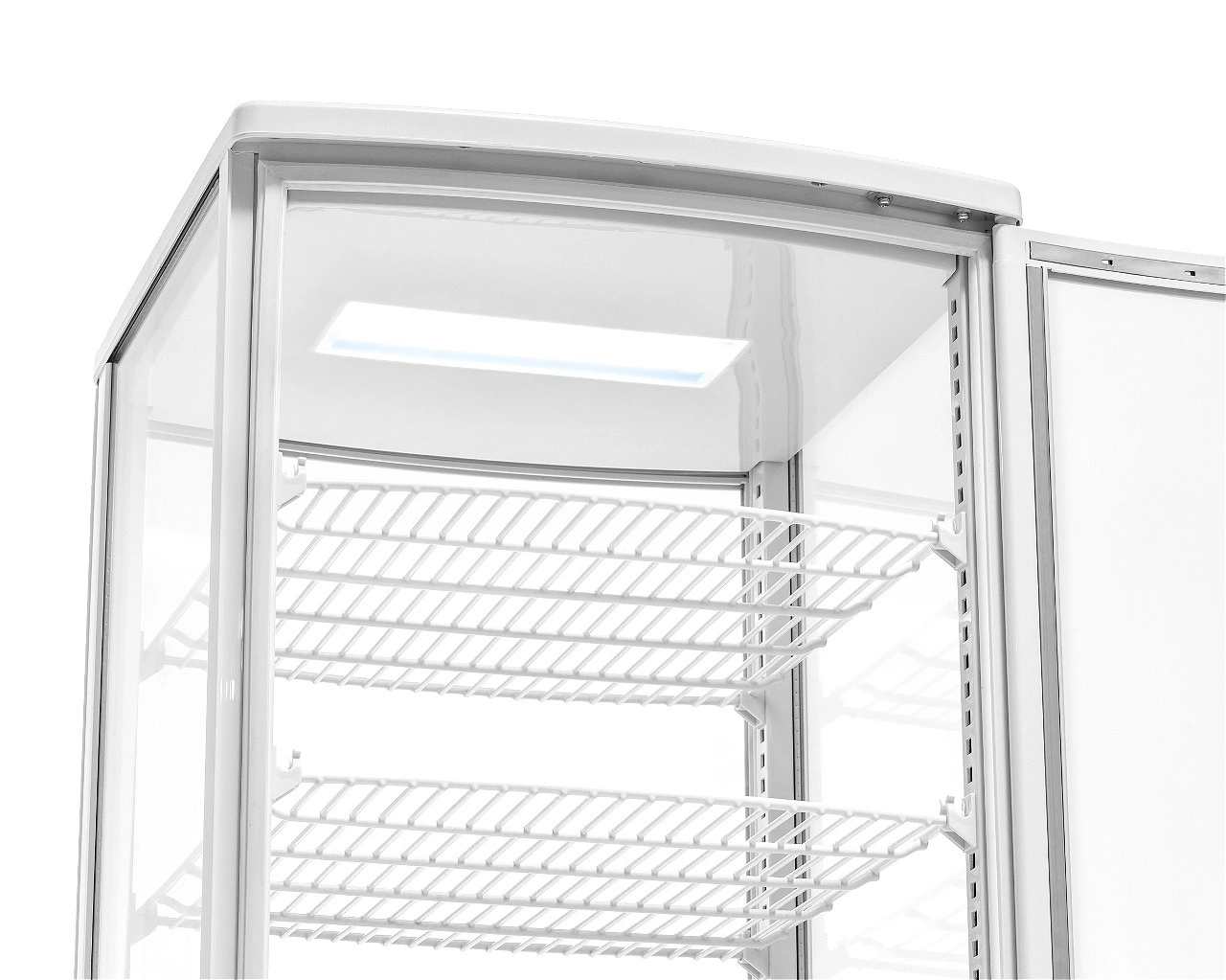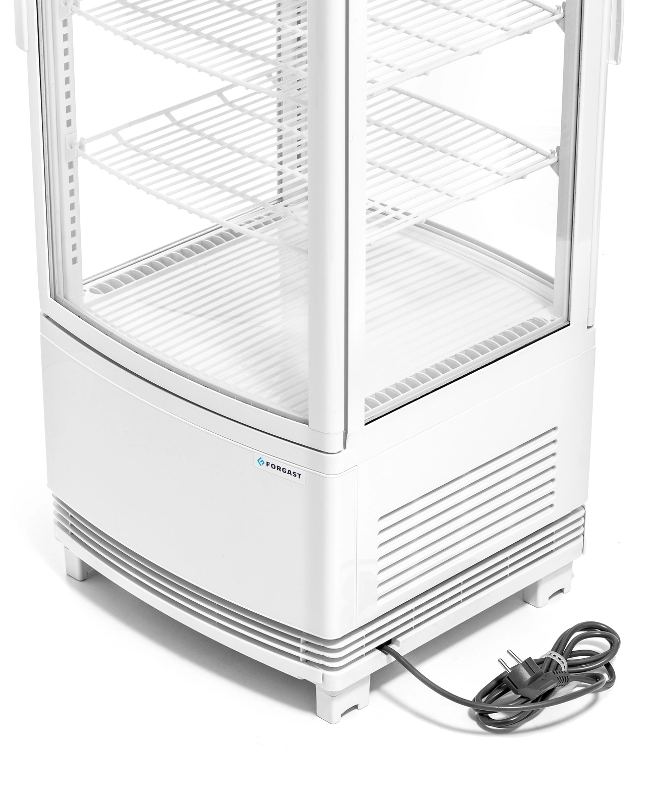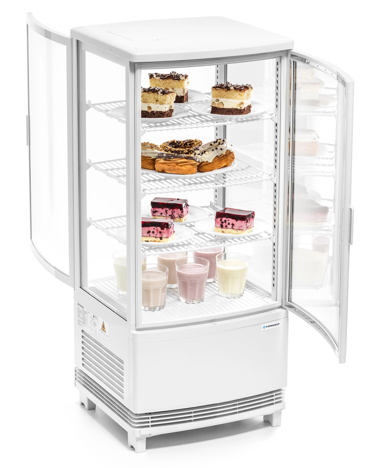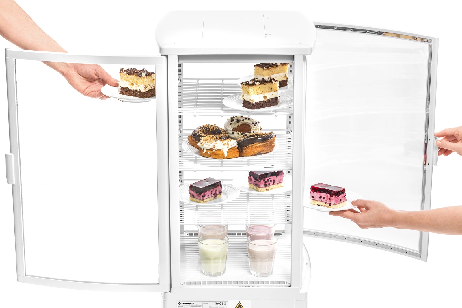 Vitrína FORGAST FG07758 bola navrhnutá s dôrazom na pohodlnú a estetickú prezentáciu potravín. Jej moderný biely kryt sa skvele hodí do rôznych interiérov, od klasických po moderné. Štvorsmerné presklenie umožňuje prezentáciu produktov z každej strany, čo je obzvlášť dôležité v cukrárňach, kaviarňach alebo hotelových bufetoch, kde je dôležitý rýchly kontakt zákazníka s ponúkaným sortimentom. Vitrína sa osvedčí aj v potravinách na prezentáciu šalátov, dezertov, sendvičov alebo nápojov.