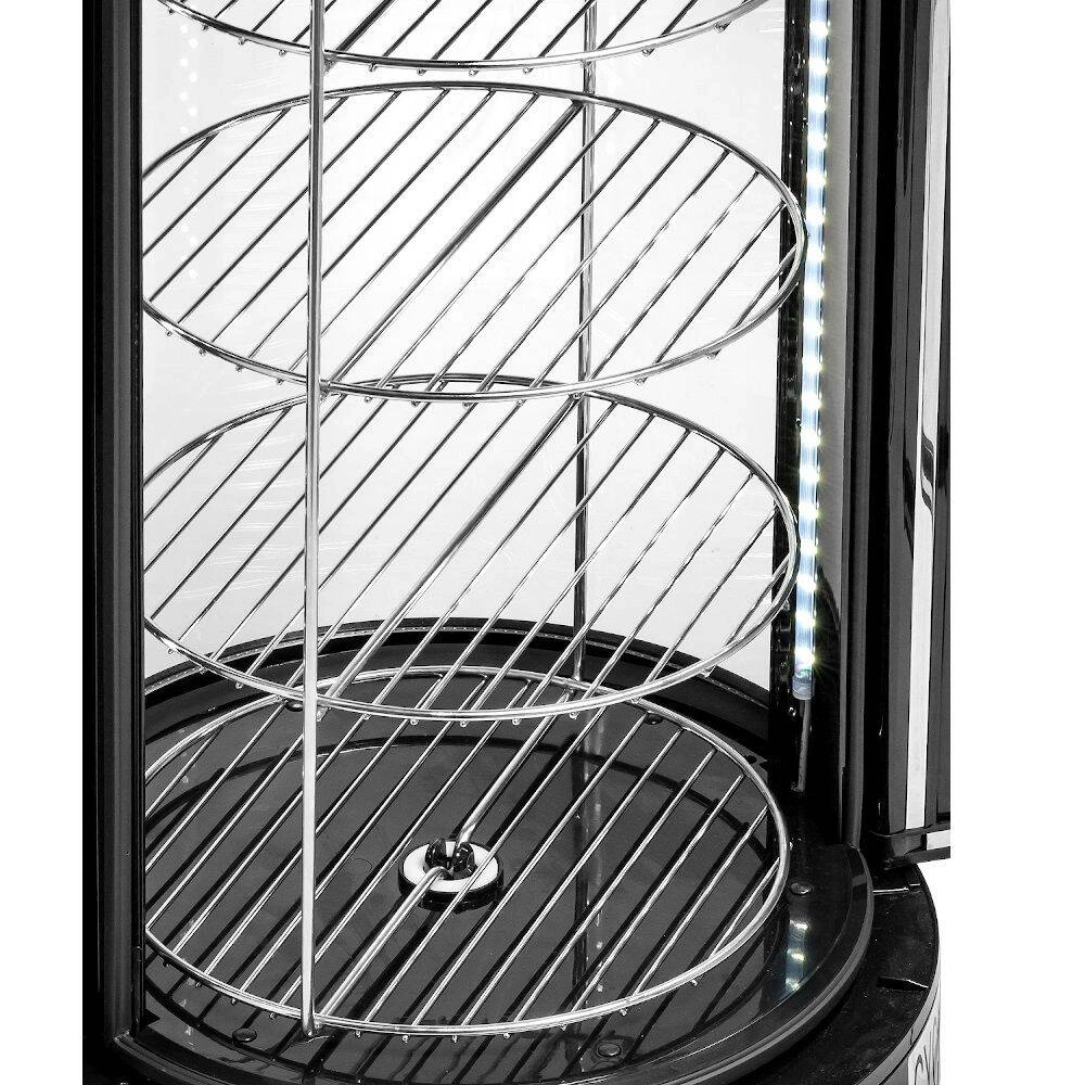 Korpus vitríny je vyhotovený v elegantnej čiernej farbe, čo umožňuje jej jednoduché začlenenie do moderných interiérov. Štyri chrómované police umiestnené vo vnútri zariadenia sú nielen odolné, ale aj ľahko udržiavateľné v čistote. Otočný mechanizmus zaručuje, že každý produkt bude dobre viditeľný zo všetkých strán. Automatický systém odmrazovania eliminuje potrebu ručného odstraňovania námrazy, čím zvyšuje komfort každodennej prevádzky. Súčasťou balenia je sada políc a všetky potrebné prvky na pripojenie zariadenia k napájaniu.