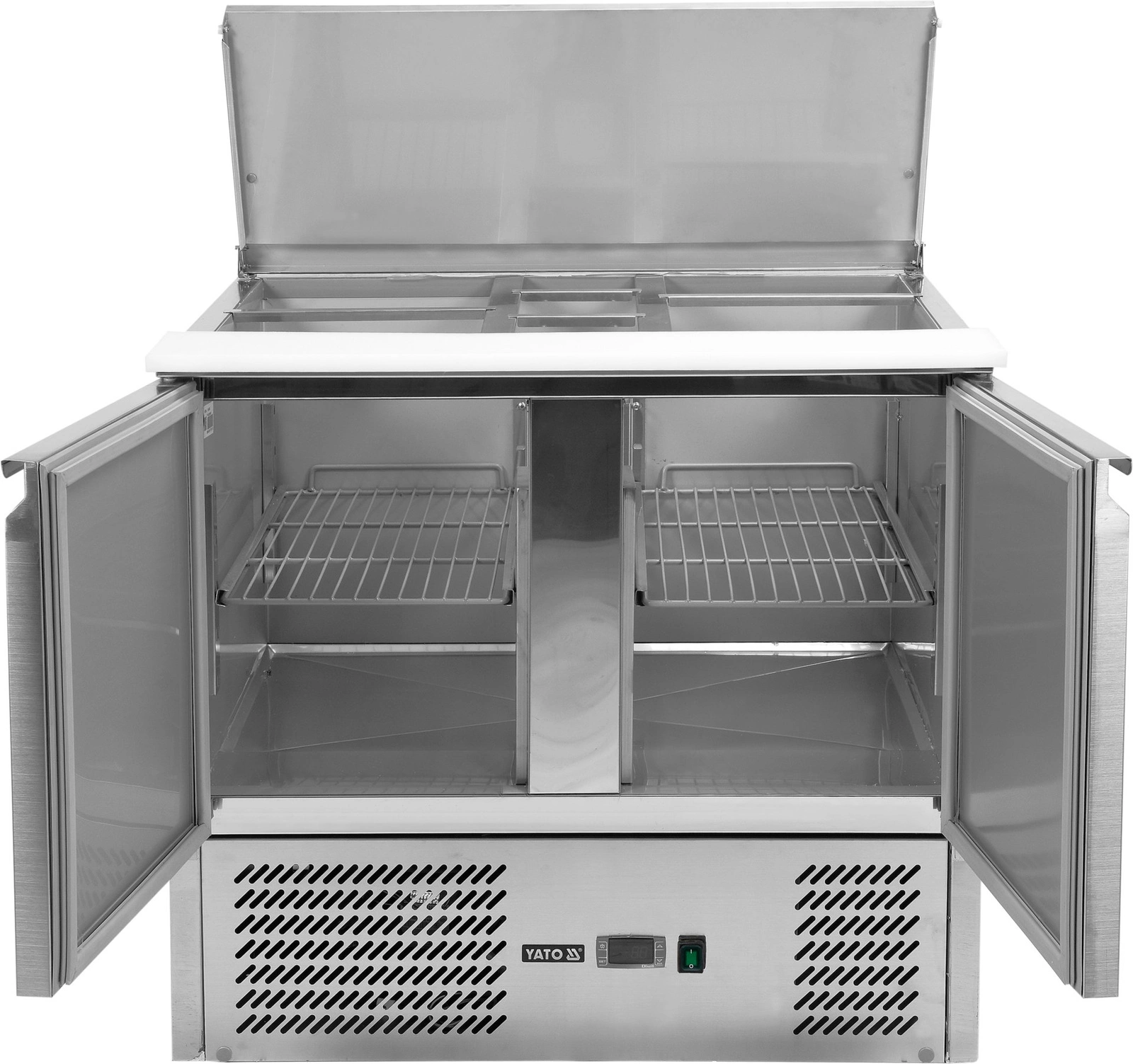 Dvojdverová chladiaca šalátová stanica YATO s rozmermi 90x70x87,6 cm a objemom 240 litrov. Určená na skladovanie potravín v teplotnom rozsahu od -2 °C do +8 °C. Vonkajší a vnútorný plášť z vysokokvalitnej nehrdzavejúcej ocele 201 zaručuje elegantný vzhľad a zároveň sa veľmi ľahko čistí. Vrchná časť má navyše sklápací veko z nehrdzavejúcej ocele gór. Stó³³ bola vybavená výklopnými, samozatváracími dverami s ergonomickými rukoväťami a každé dvere sú vybavené jedným Rošt s PVC povlakom (32,5 x 56 cm) s maximálnou nosnosťou 40 kg pri ustálenom zaťažení. Tento model umožňuje aj skladovanie kontajnerov GN 1/1ós.
