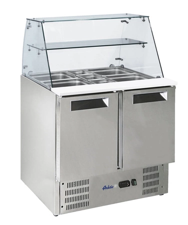 Chladiaci dvojdverový šalátový stôl so skleneným nadstavcom Značka Arktic. Puzdro vyrobené z vysokokvalitnej nehrdzavejúcej ocele. Statické chladenie s ventilátorom. Automatické odparovanie kondenzátu. Rozšírenie Vybavené prídavnou policou. Stôl vhodný pre 2x GN 1/1 a 3x GN 1/6 (15 cm). Digitálny displej. Elektronický termostat. Dvierka vybavené pohodlnou tvarovanou rukoväťou. 4 plastové nožičky. Spodná jednotka.