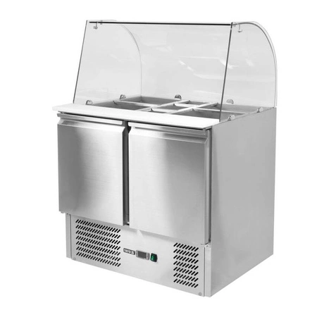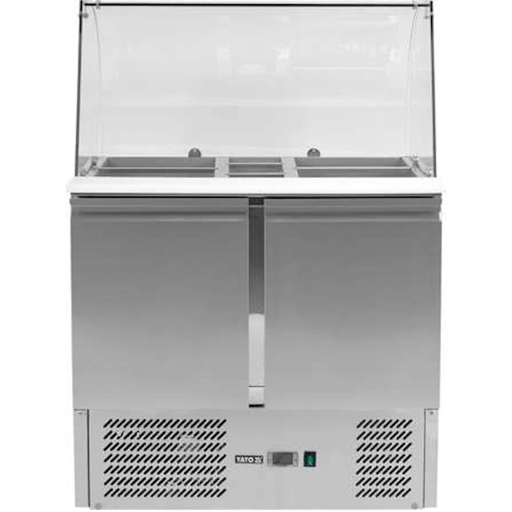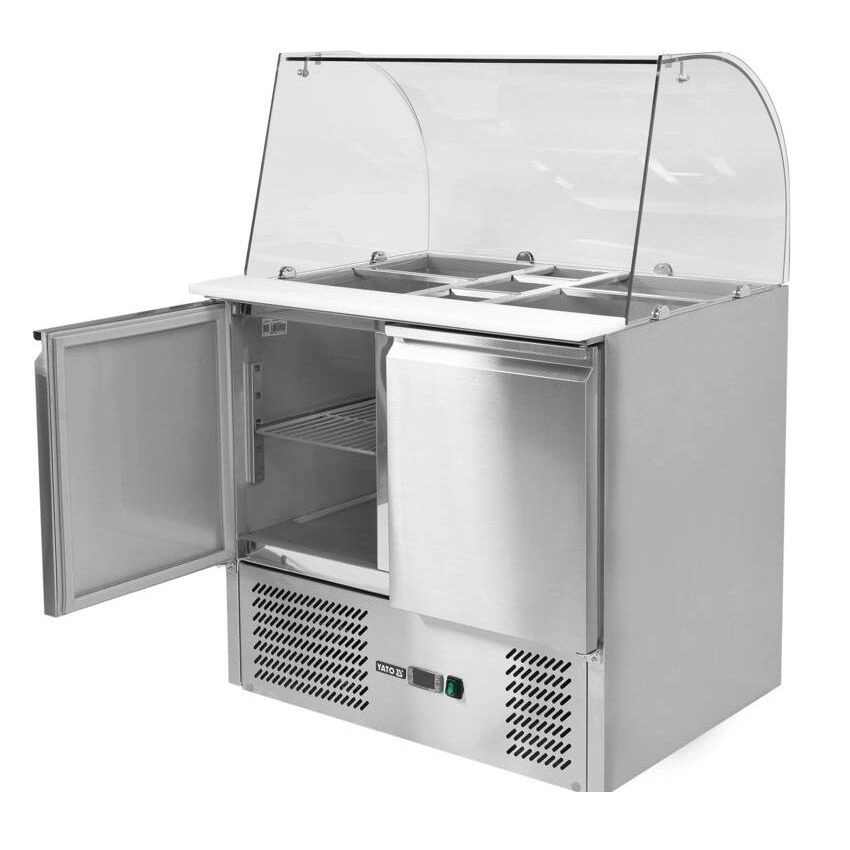 Dvojdverová chladnička na šalát so skleneným nadstavcom z tvrdeného skla s objemom 240 litrov a rozmermi 90x70x85 cm od spoločnosti YATO. Určená na skladovanie potravín v teplotnom rozsahu od +2 stupňov C do +8 stupňov C. Vonkajší a vnútorný plášť z vysokokvalitnej nehrdzavejúcej ocele 201 zaručuje elegantný vzhľad a zároveň sa veľmi ľahko čistí. Vrchná časť má navyše výklopný kryt gór vyrobený z nehrdzavejúcej ocele. Stó³³ je vybavená výklopnými, samozatváracími dvierkami s ergonomickými rukoväťami a každé dvierka sú vybavené jednou roštovou podložkou s PVC povlakom (32,5 × 56 cm) s maximálnou nosnosťou 40 kg pri rovnomernom zaťažení. Tento model umožňuje aj skladovanie kontajnerov GN 1/1ós.