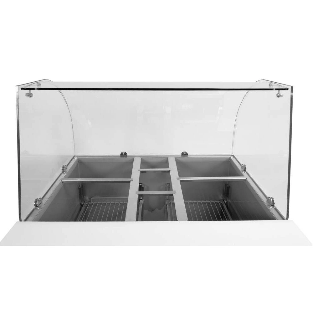 Stôl má pomocnú dosku z polyetylénu a navyše veľký otvor pre 4x GN1/2 a 3x GN 1/6 nádoby s maximálnou hĺbkou 15 cm, do ktorých možno uložiť rôzne druhy príloh a šalátových ingrediencií. Nádoby nie sú súčasťou balenia. Účinné chladenie zabezpečuje spodný chladič s výkonom 170 W, ktorý používa chladivo R600a. Zariadenie je zaradené do klimatickej triedy 4 s maximálnou teplotou okolia 30C a 55 % relatívnej vlhkosti, zatiaľ čo elektronický regulátor Dixell s digitálnym zobrazením teploty zaručuje presnú reguláciu. Má funkciu automatického odmrazovania.