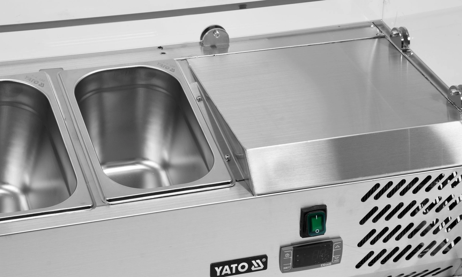 Chladiaci zásobník 7x1/4 GN s rovným oknom z tvrdeného skla z nehrdzavejúcej ocele. Vnútorný a vonkajší plášť z nehrdzavejúcej ocele ss202. Statické chladenie s funkciou automatického rozmrazovania. Bočná chladiaca jednotka značky Zanussi 110 W, chladivo R600a Vitrína je vhodná pre GN nádobyós maximálnou hĺbkou 15 cm. Jednotka má teplotný rozsah +2 až +8 stupňov a je riadená elektronickým regulátorom s displejom.