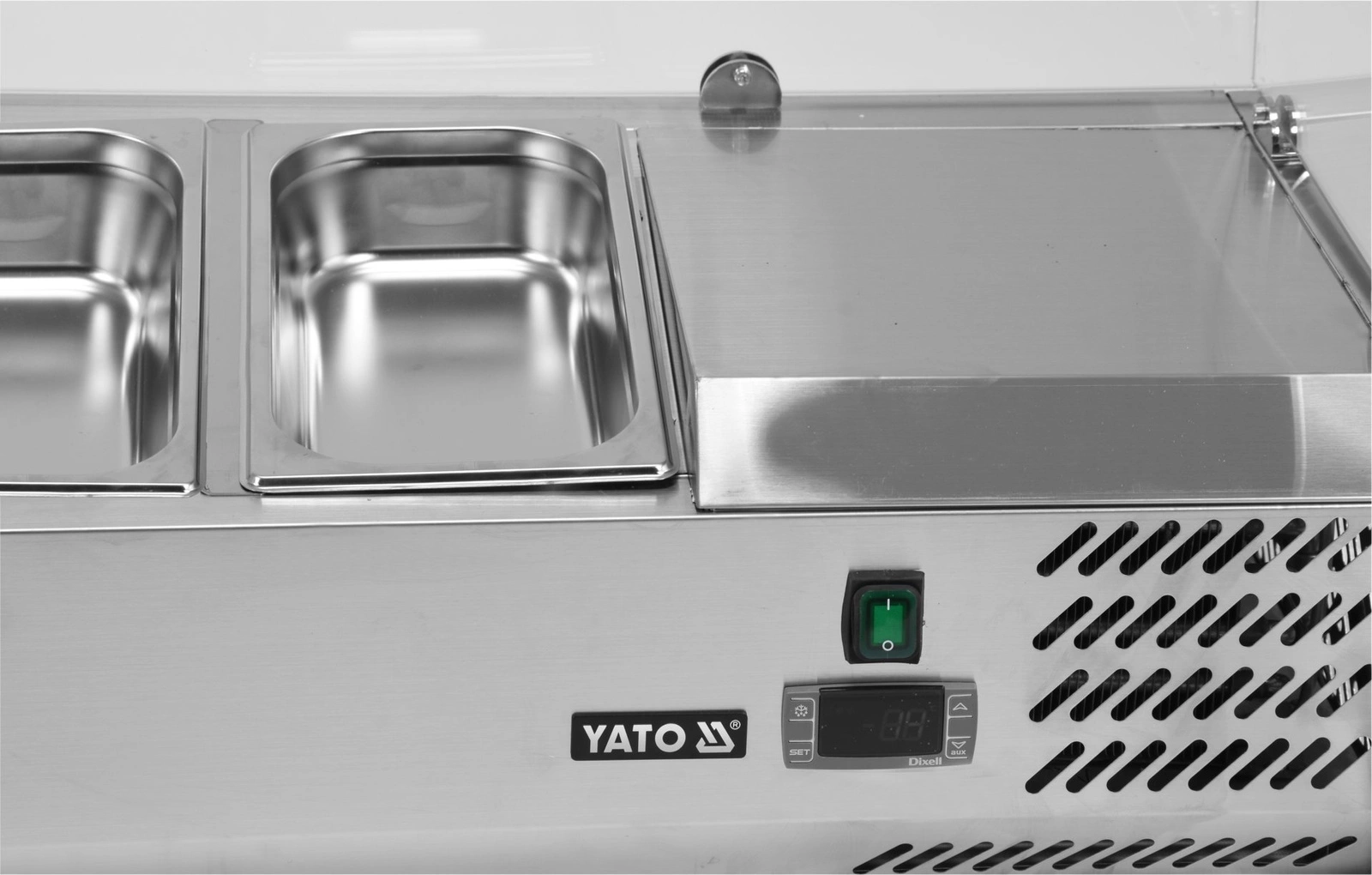 Chladiaci zásobník s kapacitou 9x1/3 GN s rovným oknom z tvrdeného skla z nehrdzavejúcej ocele. Vnútorný a vonkajší plášť z nehrdzavejúcej ocele ss 202. Statické chladenie s funkciou automatického rozmrazovania. Bočná chladiaca jednotka značky Zanussi 110 W, chladivo R600a Vitrína je vhodná pre GN nádobyós maximálnou hĺbkou 15 cm. Zariadenie pracuje v teplotnom rozsahu od +2 do +8 stupňov, regulácia teploty je prostredníctvom elektronického regulátora s displejom.