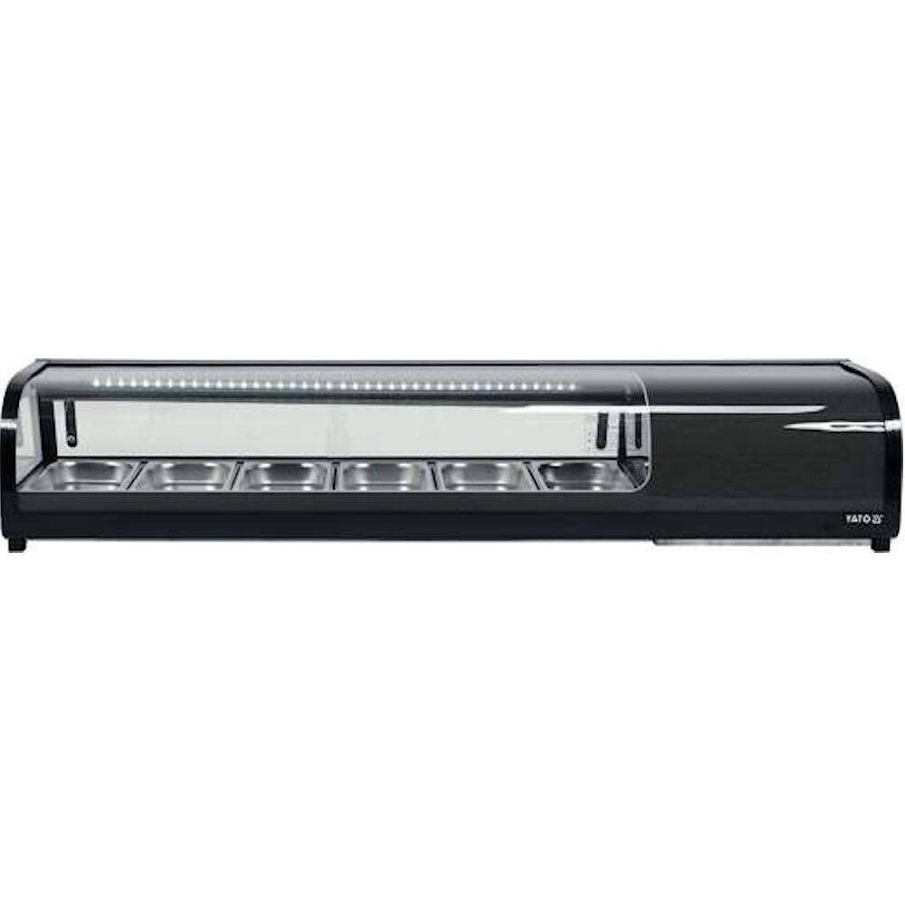 Chladiaca vitrína na sushi 6x1/3 GN. Dodáva sa so 6 nádobami GN 1/3 z nehrdzavejúcej ocele. Posuvné dvere z tvrdeného skla umožňujú prístup do priehradky. Zaoblené predné sklo tiež z tvrdeného skla, nad ktorým je LED osvetlenie. Chladivo R600a, teplotný rozsah 0-12 o C. Statické chladenie s funkciou automatického odmrazovania. Elektrický regulátor s ukazovateľom teploty.