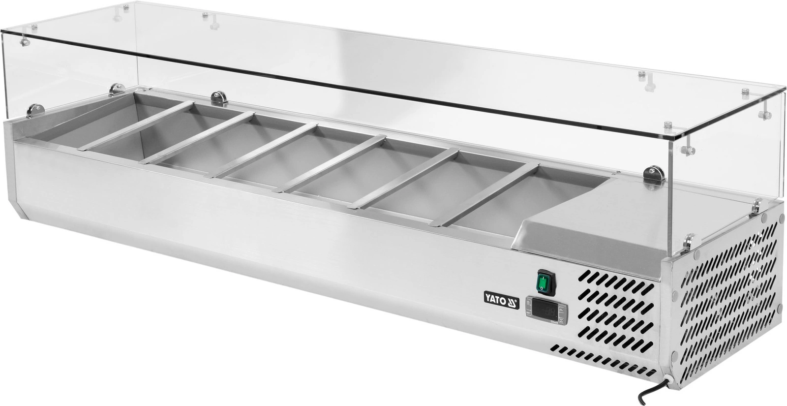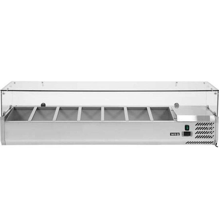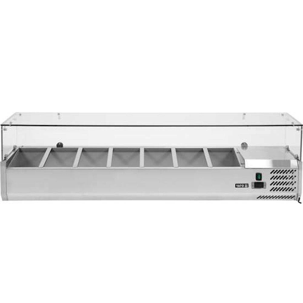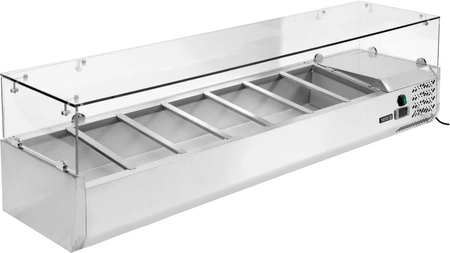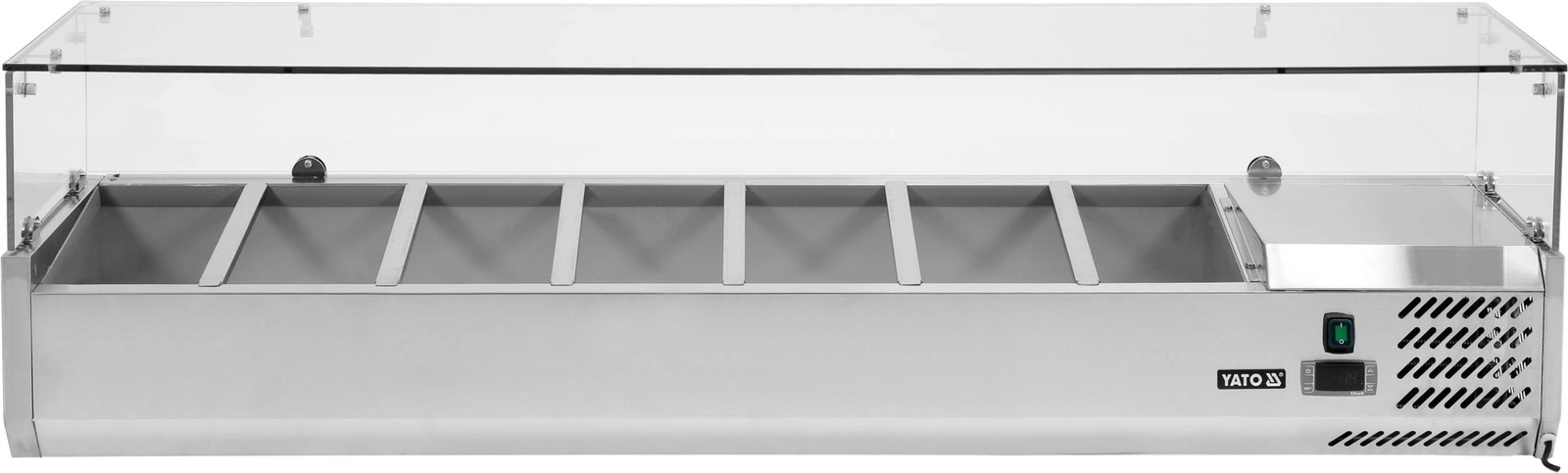 Chladiaci nadstavec s kapacitou 7x1/3 GN s rovným oknom z tvrdeného skla z nehrdzavejúcej ocele. Vnútorný a vonkajší plášť z nehrdzavejúcej ocele ss202. Statické chladenie s funkciou automatického rozmrazovania. Bočná chladiaca jednotka značky Zanussi 110 W, chladivo R600a Vitrína je vhodná pre GN nádobyós maximálnou hĺbkou 15 cm. Jednotka pracuje v teplotnom rozsahu od +2 do +8 stupňov. Regulácia teploty sa vykonáva pomocou elektronického regulátora s displejom.