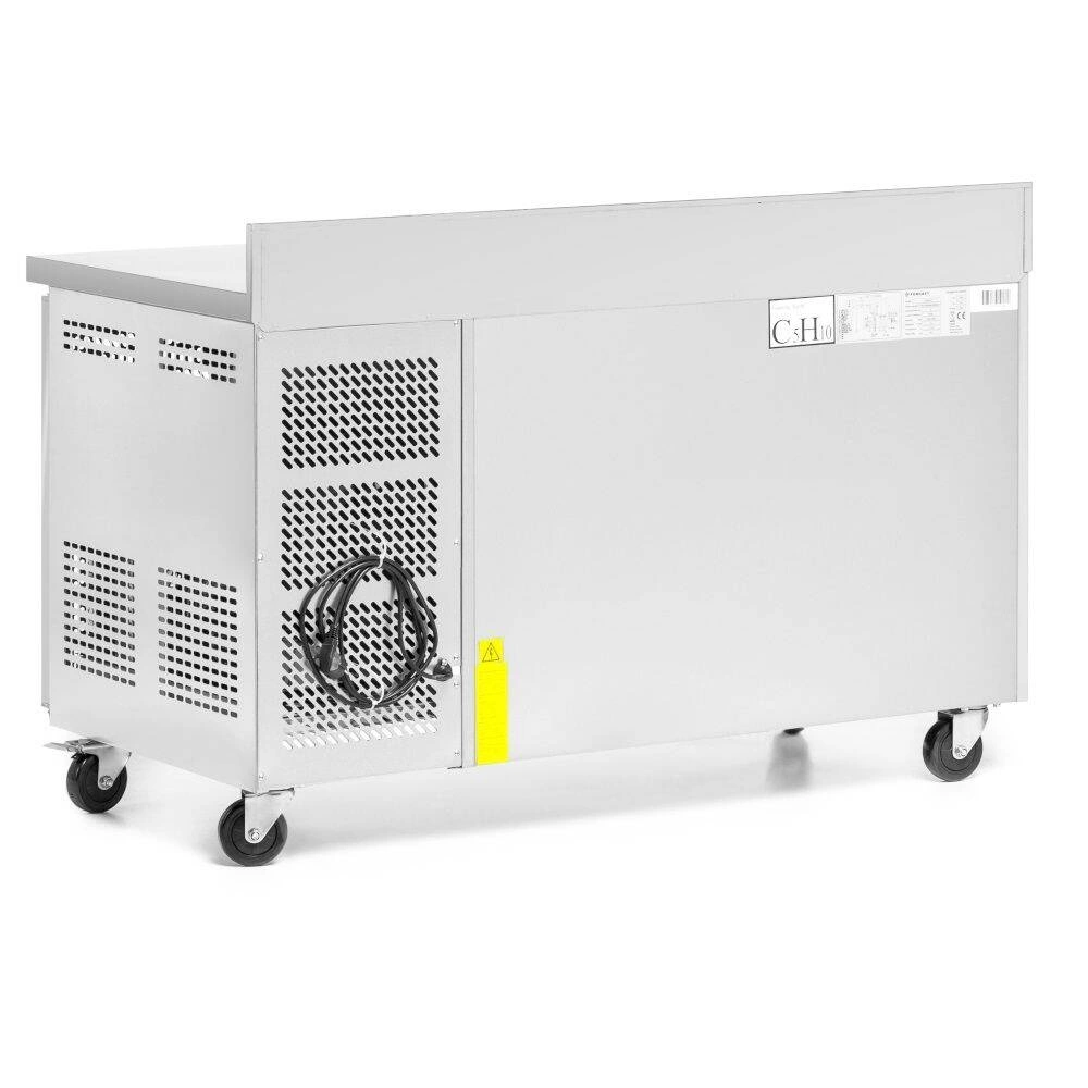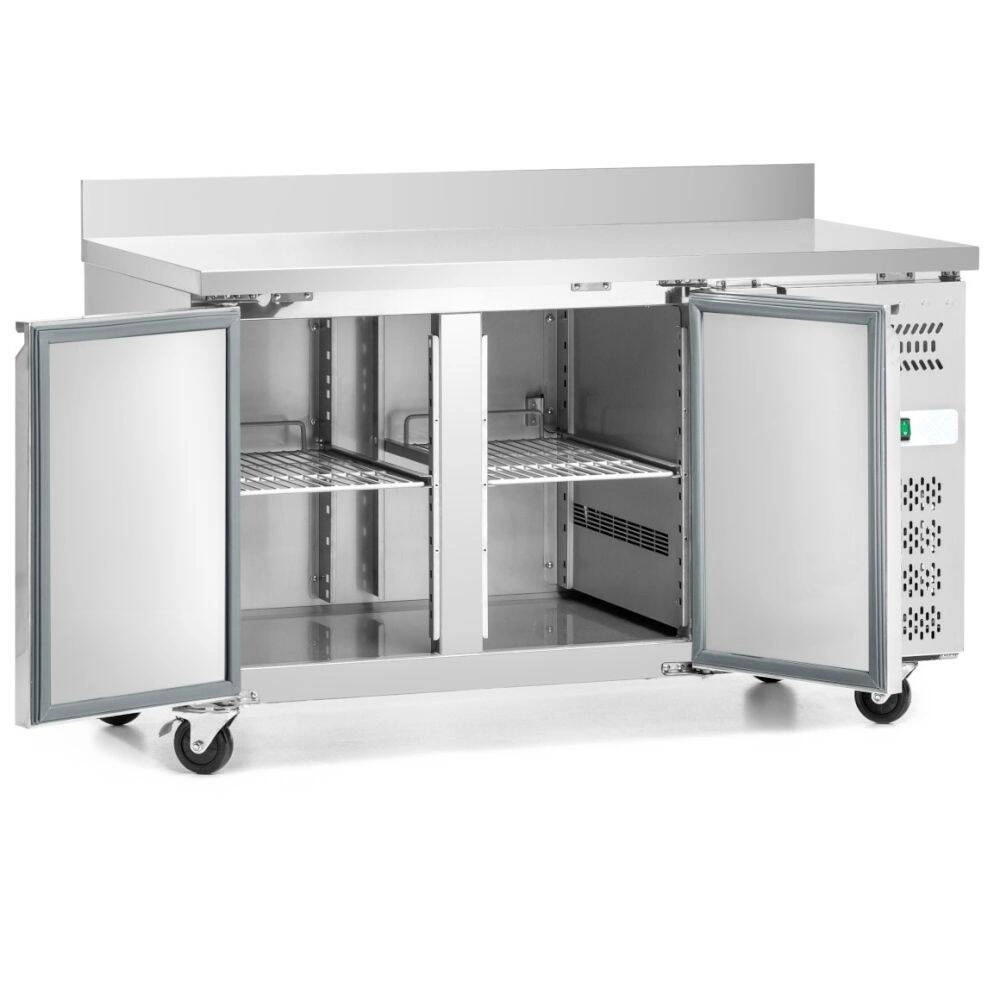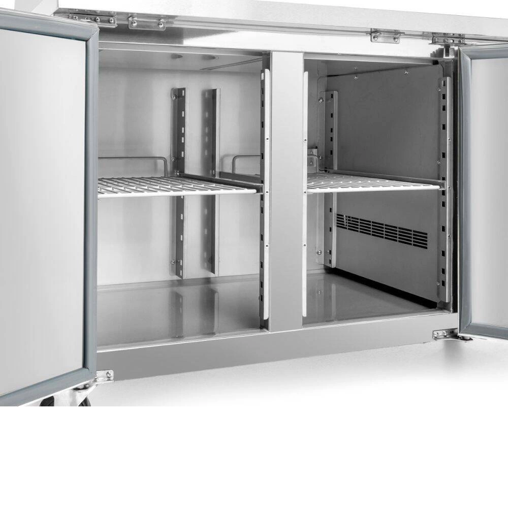 Chladiaci stôl je vybavený pracovnou doskou z nehrdzavejúcej ocele so zadným lemom s výškou 10 cm, ktorý zabraňuje padaniu produktov počas práce. Zaoblené rohy komory uľahčujú čistenie, čo je dôležité pri každodennom používaní. Vnútro je rozdelené na dve priestranné komory, pričom každá z nich má policu umožňujúcu organizáciu skladovaných produktov. Jednoducho vyberateľné tesnenie dverí umožňuje rýchle čistenie a údržbu. Bočná jednotka zaisťuje voľný prístup k celej pracovnej ploche stola a automatické odmrazovanie minimalizuje potrebu manuálnych zásahov.