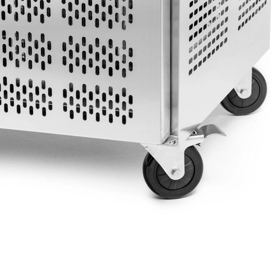 • Pohodlný prístup a ergonómia – stôl má dvoje dverí s profilovanou rukoväťou po celej dĺžke, čo uľahčuje otváranie aj v kuchynských rukaviciach. Navyše namontované kolieska umožňujú jednoduché presúvanie zariadenia, čo výrazne uľahčuje reorganizáciu pracovného priestoru.