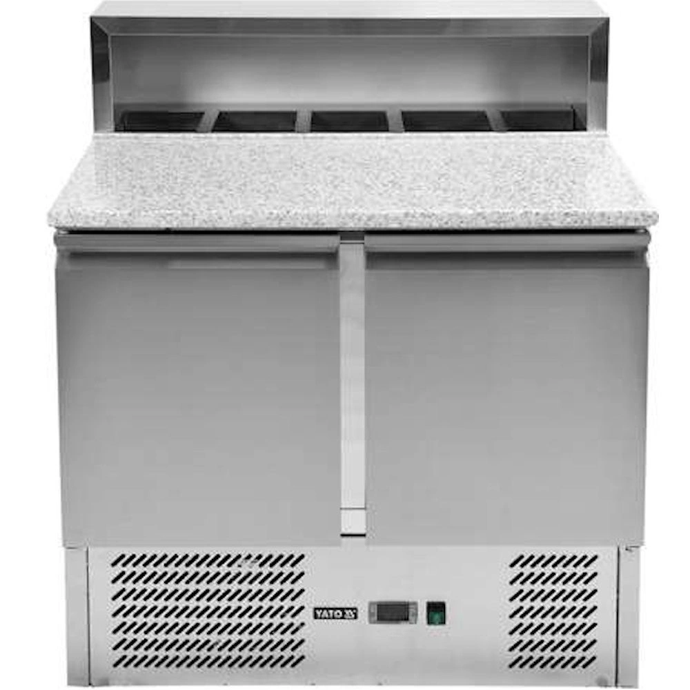 Dvojdverový chladiaci stôl na pizzu s nadstavbou YATO YG-05275 je profesionálne gastronomické zariadenie určené na prípravu a skladovanie surovín na pizzu. Vyznačuje sa pevnou konštrukciou z nehrdzavejúcej ocele, mramorovou pracovnou doskou a praktickou chladiacou nadstavbou. Ideálna voľba pre pizzérie, reštaurácie a gastronomické prevádzky, kde záleží na efektívnosti práce a zachovaní čerstvosti surovín.