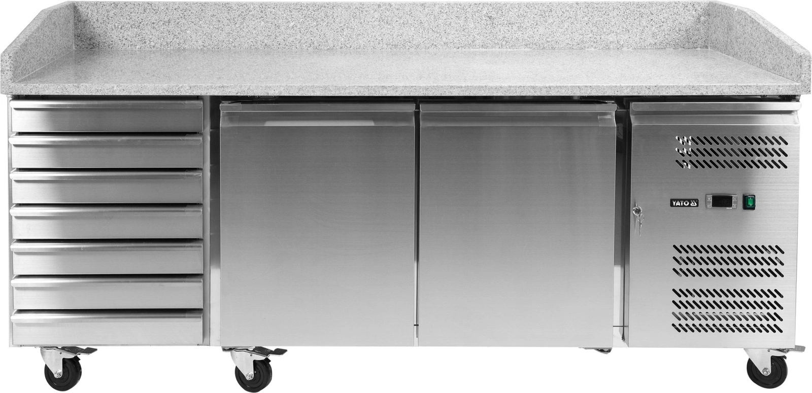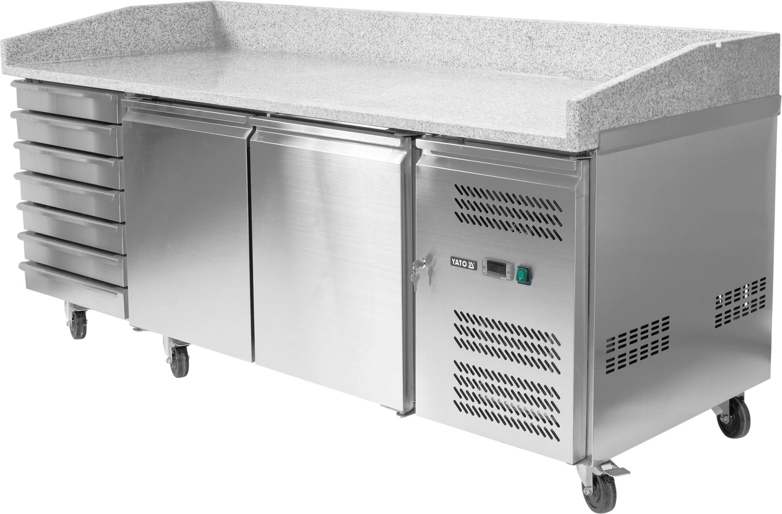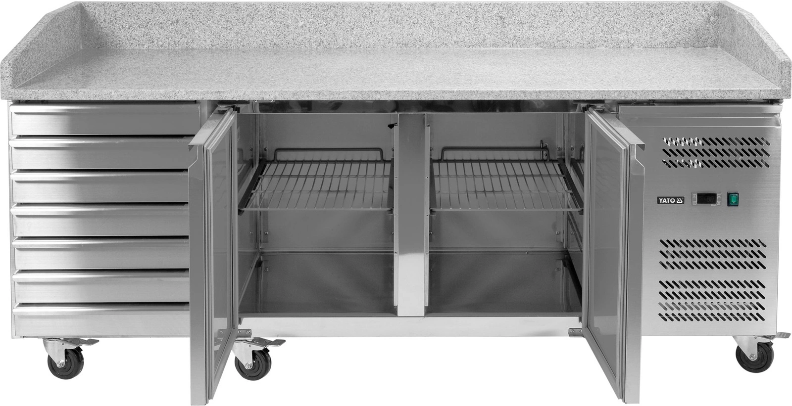 Chladiaci stôl na pizzu s 2 dverami a zásuvkami YATO YG-05310 je profesionálne gastronomické zariadenie, ktoré sa skvele hodí do pizzerií, reštaurácií a rýchlych občerstvení. Je vybavený dvoma chladenými komorami a až siedmimi praktickými nechladenými zásuvkami, čo umožňuje pohodlné uskladnenie surovín aj kuchynského príslušenstva. Pracovná doska z granitu zaručuje odolnosť a komfort pri príprave pizze.