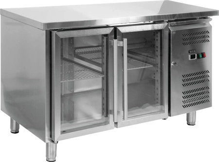 Chladiaci stôl 2-dverový presklený značky YATO - línia 700 s rozmermi pracovnej dosky 136x70 cm a nastaviteľnou výškou 85-91 cm. Objem 282 l. Vnútorný aj vonkajší plášť je vyrobený z nehrdzavejúcej ocele ss201, samozatváracie dvere sú z dvojitého tvrdeného skla, na ktoré sú pripevnené úchyty na otváranie. Súčasťou výbavy sú 2 police (po jednej na každé dvere) s rozmermi 33x53 cm a nosnosťou 40 kg každá. Chladiace komory sú vybavené LED osvetlením. Chladiace médium R290 je určené na prevádzku v 4. klimatickej triede - pri maximálnej teplote okolia 30o C a relatívnej vlhkosti 55 %. Zariadenie má elektronický ovládač s digitálnym displejom teploty.