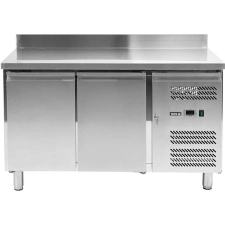 Chladiaci stôl 2-dverový s lemom značky YATO - línia 700 s rozmermi 136x70x95cm s možnosťou nastavenia výšky 12-18 cm. Objem 282 l. Plášť a pracovná doska sú vyrobené z nehrdzavejúcej ocele ss201, stôl má navyše zadný lem s výškou 10 cm. Samozatváracie dvere s pohodlnými úchytkami na otváranie. Vybavenie zahŕňa 2 roštové police (po jednej na dvere) potiahnuté PVC s maximálnou nosnosťou 40 kg – pri rovnomernom zaťažení, police sú prispôsobené na skladovanie GN 1/1 nádob.