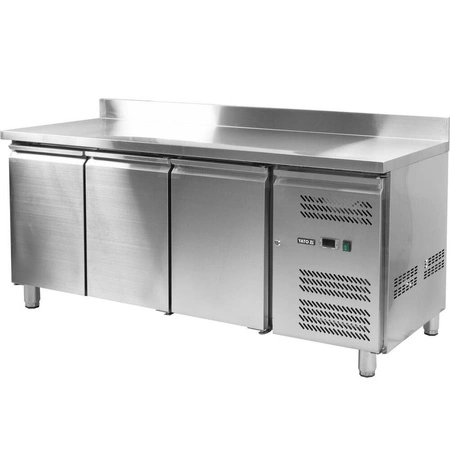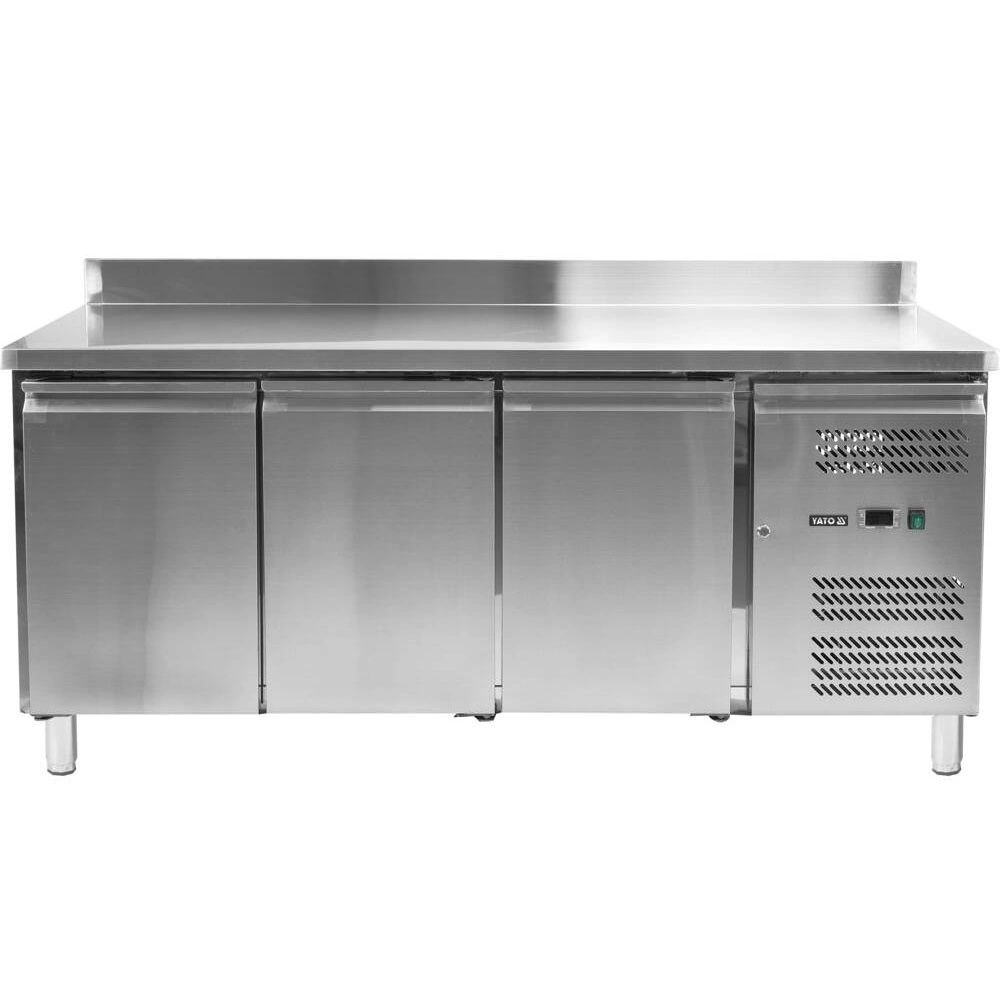 Chladiaci stôl 3-dverový s lemom značky YATO s rozmermi pracovnej dosky 179,5x70x95 cm a objemom 417 l. Navrhnutý na skladovanie potravín v rozsahu teplôt od -2°C do +80°C. Vonkajší aj vnútorný plášť je vyrobený z vysokokvalitnej nehrdzavejúcej ocele SS201, čo zaručuje elegantný vzhľad a zároveň veľmi jednoduchú údržbu čistoty. Pracovná doska má zadný lem s výškou 10 cm. Stôl je vybavený 4 nožičkami s nastaviteľnou výškou v rozmedzí 12~18 cm. Stôl je vybavený tromi výklopnými, samouzavierateľnými dverami s ergonomickými držadlami, pričom každé dvere majú v balení jednu roštovú policu potiahnutú PVC s maximálnou nosnosťou 40 kg pri rovnomernom zaťažení. Tento model umožňuje aj skladovanie GN 1/1 nádob.