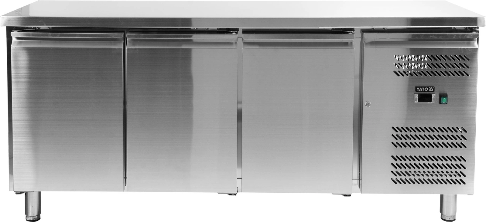 Chladiaci stôl 3-dverový značky YATO - línia 600 s rozmermi 179,5x60 cm a nastaviteľnou výškou 84,5-91,5 cm. Objem 339 l. Kryt a pracovná doska sú vyrobené z nehrdzavejúcej ocele ss201. Samozatváracie dvere. Súčasťou vybavenia sú 3 roštové police (po jednej na každé dvere) potiahnuté PVC s maximálnou nosnosťou 40 kg – pri rovnomernom zaťažení, s rozmermi 33x42,5 cm. Nastaviteľná výška políc – 11 stupňov. Zariadenie je ľahké na údržbu vďaka tomu, že je postavené na nožičkách, čo umožňuje jednoduché čistenie aj pod zariadením.