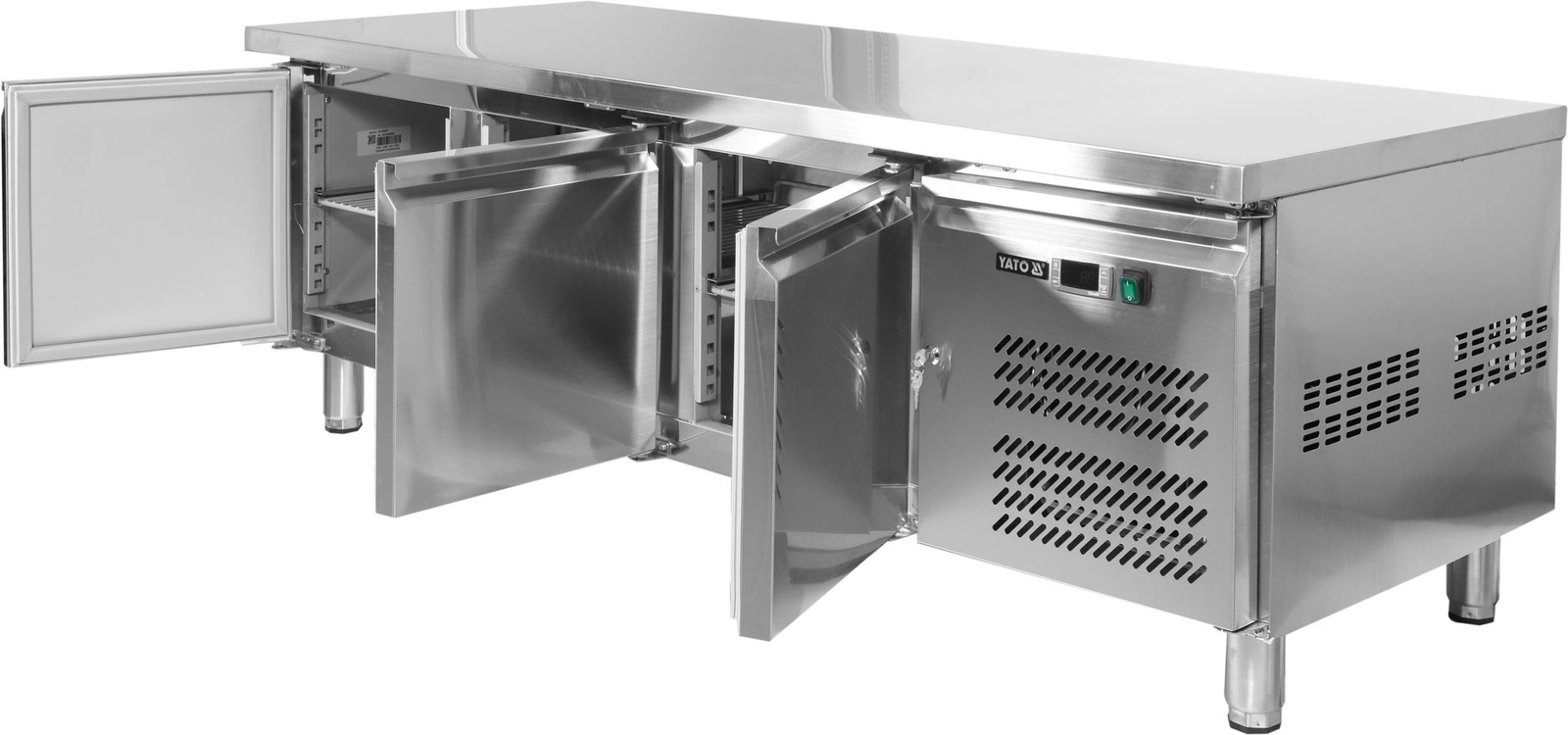 Chladiaci stôl s 3 dverami s objemom 317 l značky YATO. Stôl s rozmermi pracovnej dosky 179,5x70 cm, s nastaviteľnou výškou v rozsahu 65-72 cm. Navrhnutý na skladovanie potravín v teplotnom rozsahu od -2°C do +8°C. Vonkajšie aj vnútorné opláštenie z vysoko kvalitnej nehrdzavejúcej ocele 201 zaručuje elegantný vzhľad a zároveň je veľmi ľahko udržiavateľný v čistote. Stôl je vybavený 4 nožičkami s nastaviteľnou výškou v rozsahu 14-20 cm.
