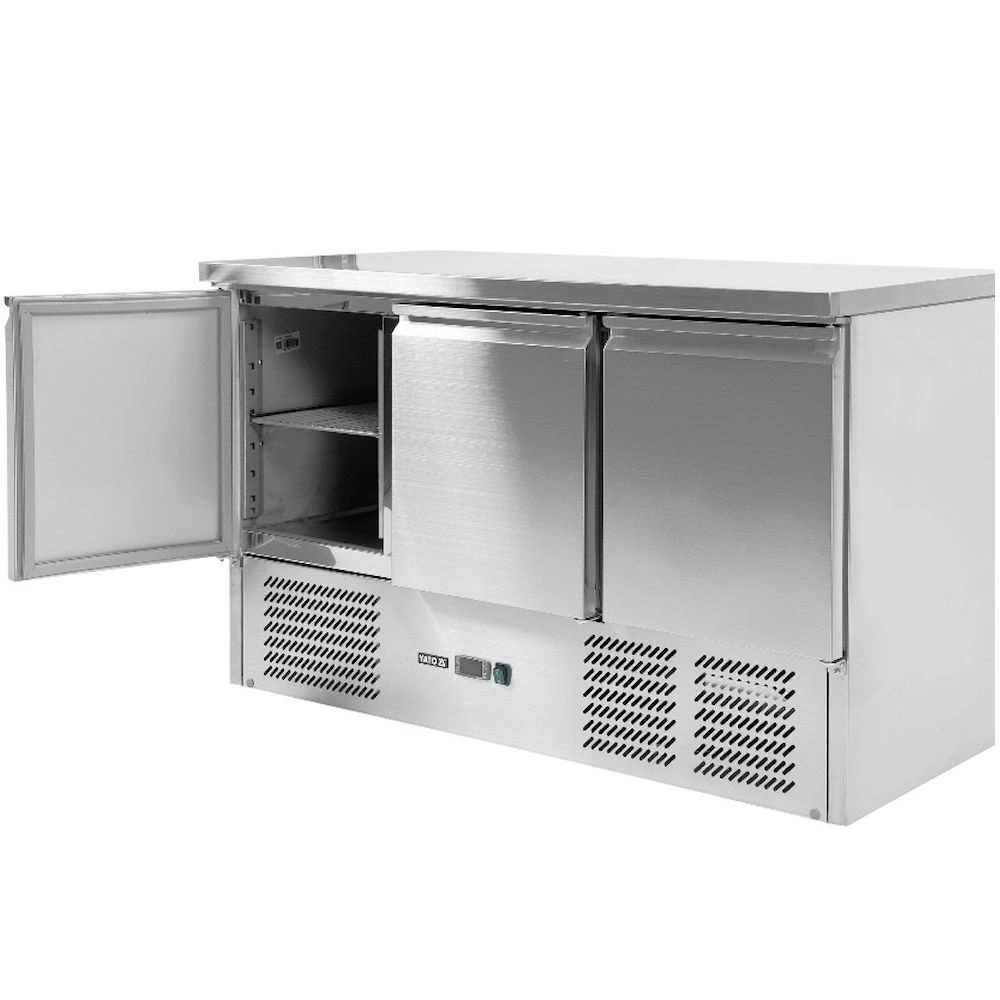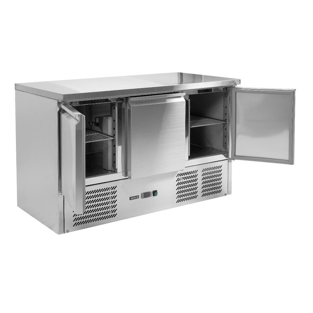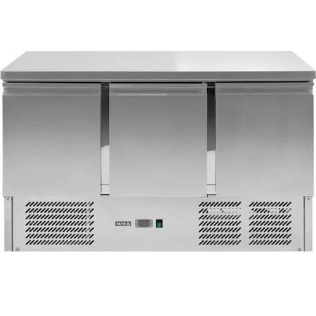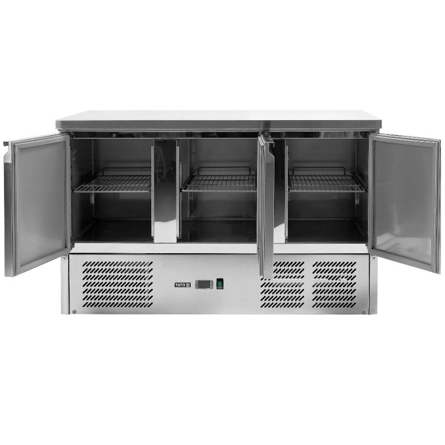 Chladiaci stôl 3-dverový značky YATO – línia 700 s rozmermi 136,5x70x87cm a objemom 368 l. Kryt a pracovná doska sú vyrobené z nehrdzavejúcej ocele ss201. Samozatváracie dvere sú vybavené zámkom. Súčasťou vybavenia sú 3 roštové police (po jednej na každé dvere) potiahnuté PVC s maximálnou nosnosťou 40 kg – pri rovnomernom zaťažení. Chladiaca komora v štandarde 1/1 GN.