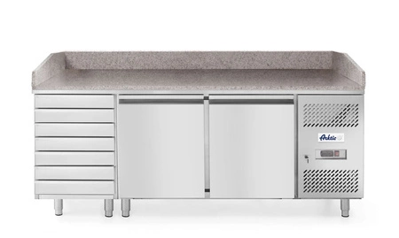 Chladiaci stôl na pizzu, 2-dverový, je profesionálne chladiace zariadenie určené pre gastronomické prevádzky, pizzerie a kuchyne, kde je dôležitá vysoká kapacita a rýchly prístup k čerstvým surovinám. Vyznačuje sa pevnou konštrukciou z nehrdzavejúcej ocele, žulovou pracovnou doskou a až siedmimi priestrannými zásuvkami, vďaka čomu je ideálny pri intenzívnej práci s cestom a prísadami na pizzu.