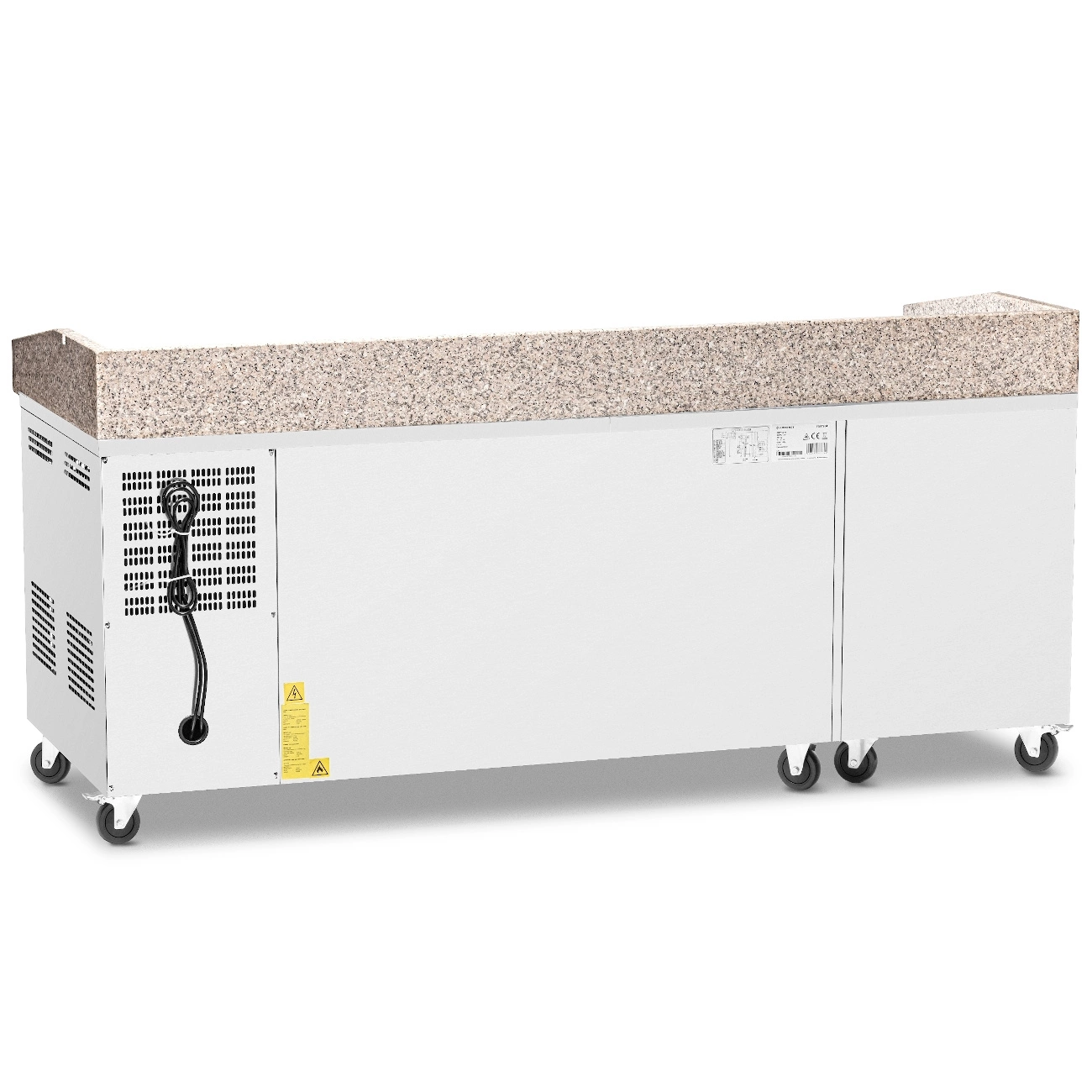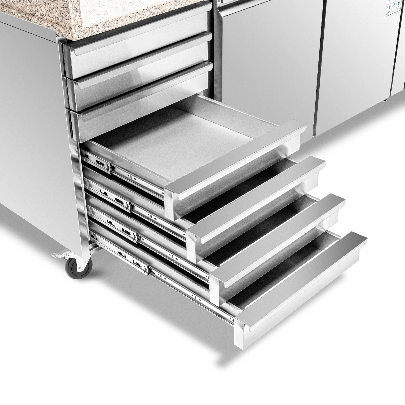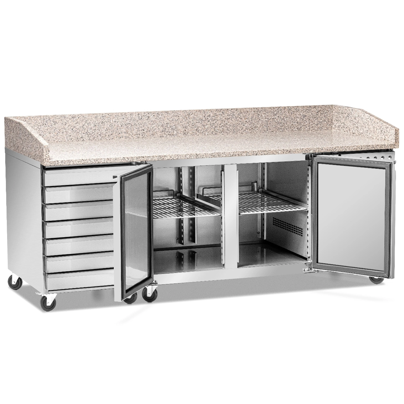 • Sedem praktických zásuviek a dve priestranné police – umožňujú pohodlnú segregáciu a rýchly prístup k produktom, čo výrazne zefektívňuje prácu kuchárov pri príprave pizze alebo šalátov.