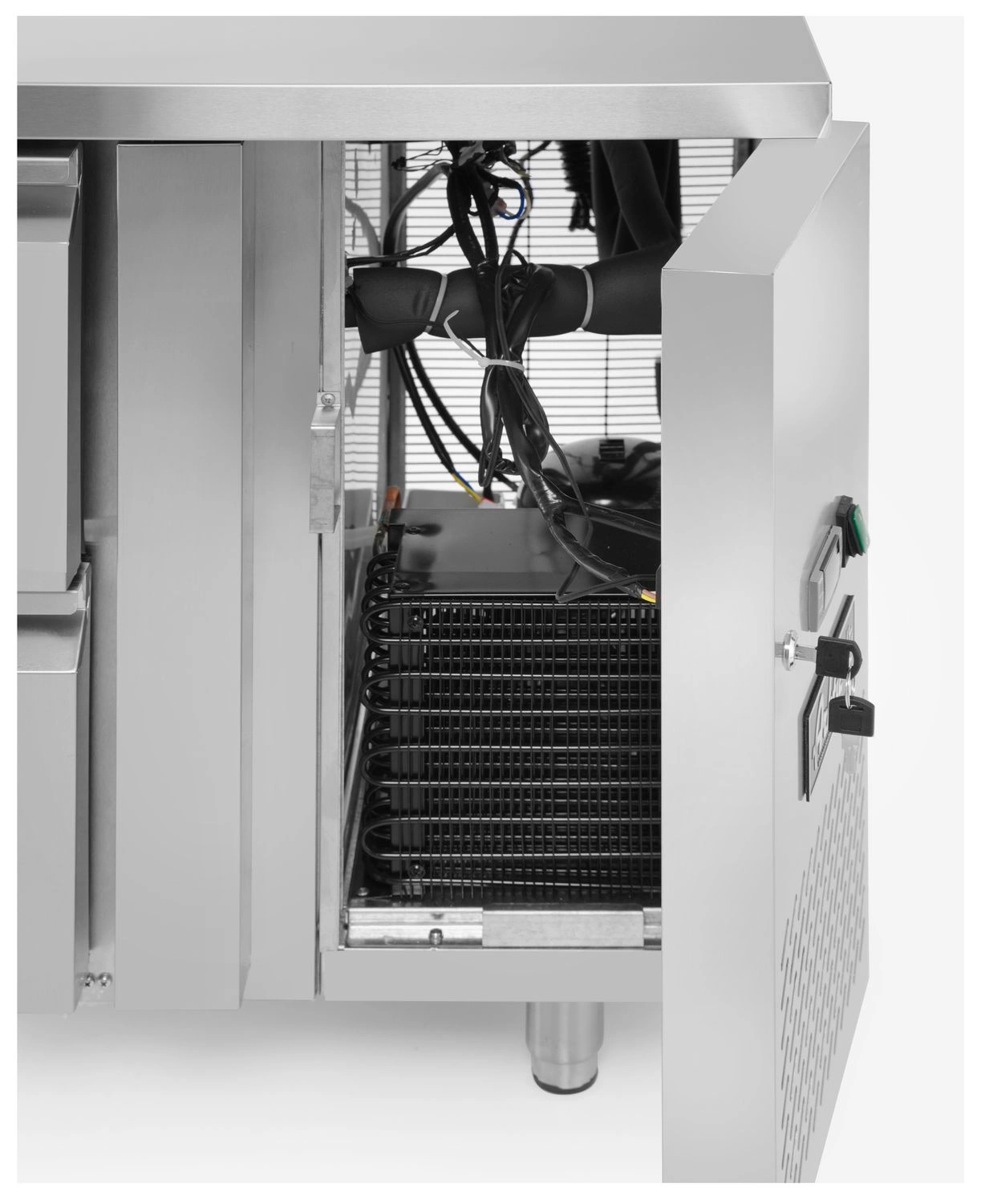 Chladiaca stanica so 4 zásuvkami a bočnou jednotkou. Puzdro je vyrobené z nehrdzavejúcej ocele. Nútené chladenie, prachový filter. Displej je digitálny s elektronickým termostatom. Automatické odparovanie kondenzátu. Môže pracovať až do 43°C teploty okolia. Dvere sú samozatváracie. Má 4 neskrutkovacie nótorky z nehrdzavejúcej ocele, ktoré sú nastaviteľné. Okraj je široký 4 cm.