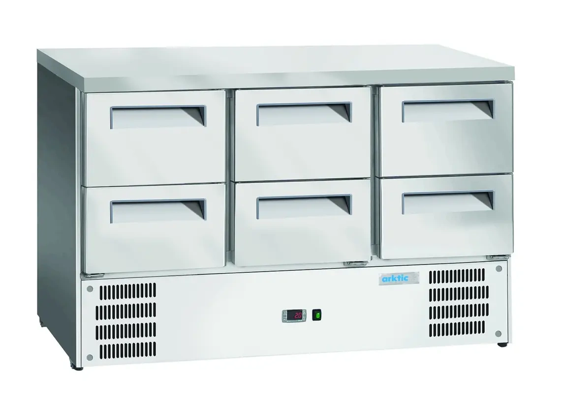 Chladiaci stôl ARKTIC 236772 je profesionálne chladiace zariadenie určené na gastronomické použitie. Je vybavený šiestimi praktickými zásuvkami GN 1/1 a konštrukciou z nehrdzavejúcej ocele, ktorá zaručuje pohodlnú organizáciu potravín a odolnosť aj pri intenzívnom používaní. Ideálny do profesionálnych kuchýň, kde je dôležitý rýchly prístup k čerstvým surovinám a efektívne využitie priestoru.