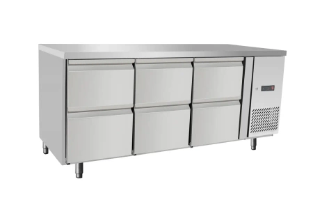 Chladiaci stôl so 6 zásuvkami GN 1/1 je profesionálne zariadenie určené na skladovanie potravín v chladených podmienkach, ideálne pre gastronómiu, reštaurácie a hotely. Vyznačuje sa vysokou funkčnosťou vďaka šiestim priestranným zásuvkám a bočne umiestnenému chladiacemu agregátu. Toto zariadenie je určené na intenzívnu prevádzku v kuchyniach, kde je dôležitý rýchly prístup k čerstvým surovinám a ergonomická organizácia pracovného priestoru.