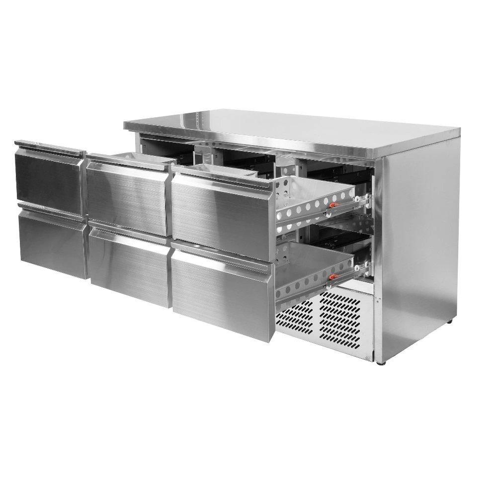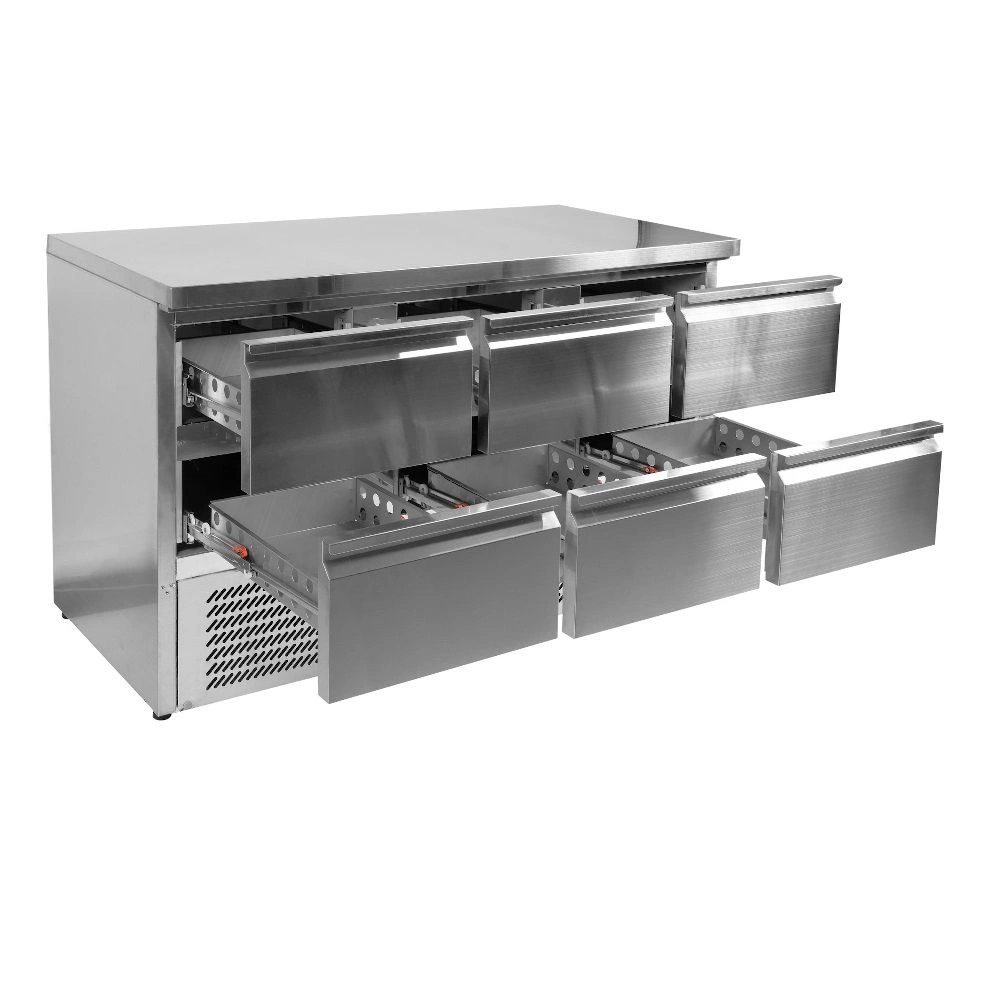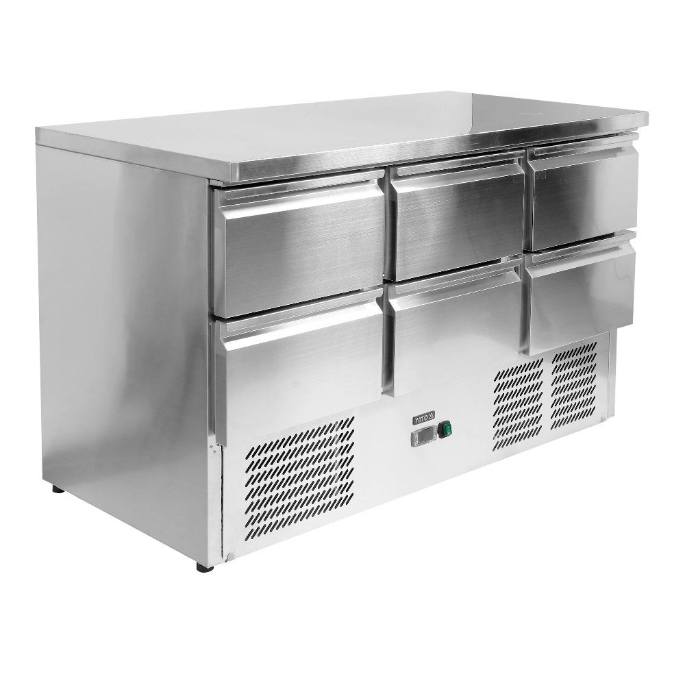 Chladiaci stôl so 6 zásuvkami značky YATO - línia 700 s pracovnou doskou s rozmermi 1365x700mm a celkovým objemom 368 l. Vnútorný a vonkajší plášť aj pracovná doska sú vyrobené z vysoko kvalitnej nehrdzavejúcej ocele SS201. Celková výška stola je 88 cm, z čoho nožičky majú výšku 2 cm a nie je možné ich nastaviť. Zásuvky pojmú GN 1/1 nádobu a fľaše s maximálnou výškou 15,5 cm. Vďaka otvorom v bočných stenách zásuviek je umožnená voľná cirkulácia vzduchu. Zásuvky sú namontované na koľajničkách s guľôčkovými ložiskami, čo umožňuje ich úplné vysunutie a vybratie napríklad na umytie. Vymeniteľné magnetické tesnenia zaručujú tesné uzavretie. Chladiaca jednotka s výkonom 240 W používa chladiace médium R290, je určená na prevádzku v 4. klimatickej triede - pri maximálnej teplote okolia 30C a relatívnej vlhkosti 55%. Zariadenie má elektronický ovládač s digitálnym displejom teploty.